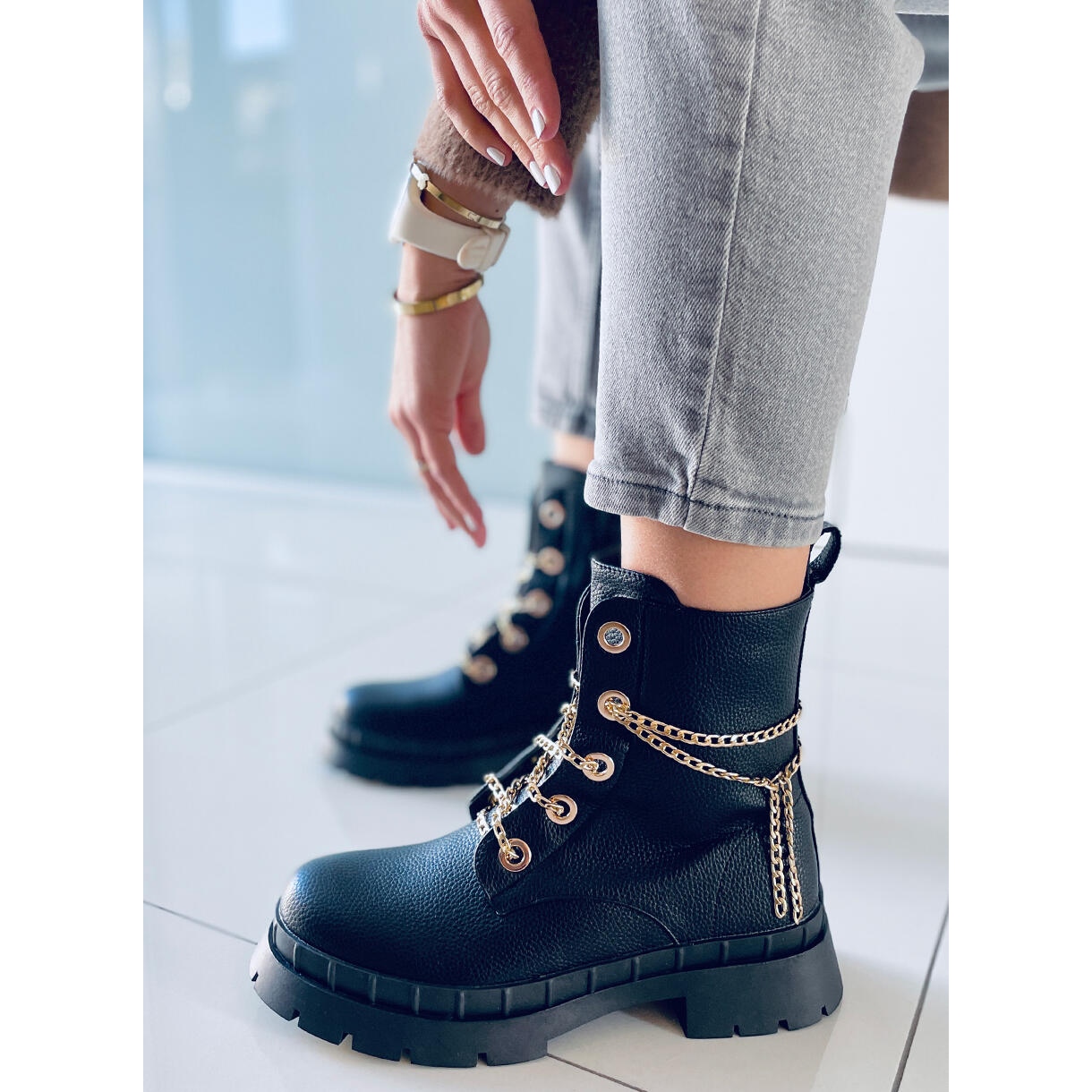 Lohan Black ankelboots med snörning är ett måste i varje damgarderob! Dessa iögonfallande svarta stövlar kännetecknas av en original design som kombinerar komfort med mode. Istället för traditionell snörning är denna modell utrustad med en stilren guldkedja, som tillför en unik karaktär. Setet innehåller även utbytbara snören, vilket gör att du kan anpassa utseendet på skorna.