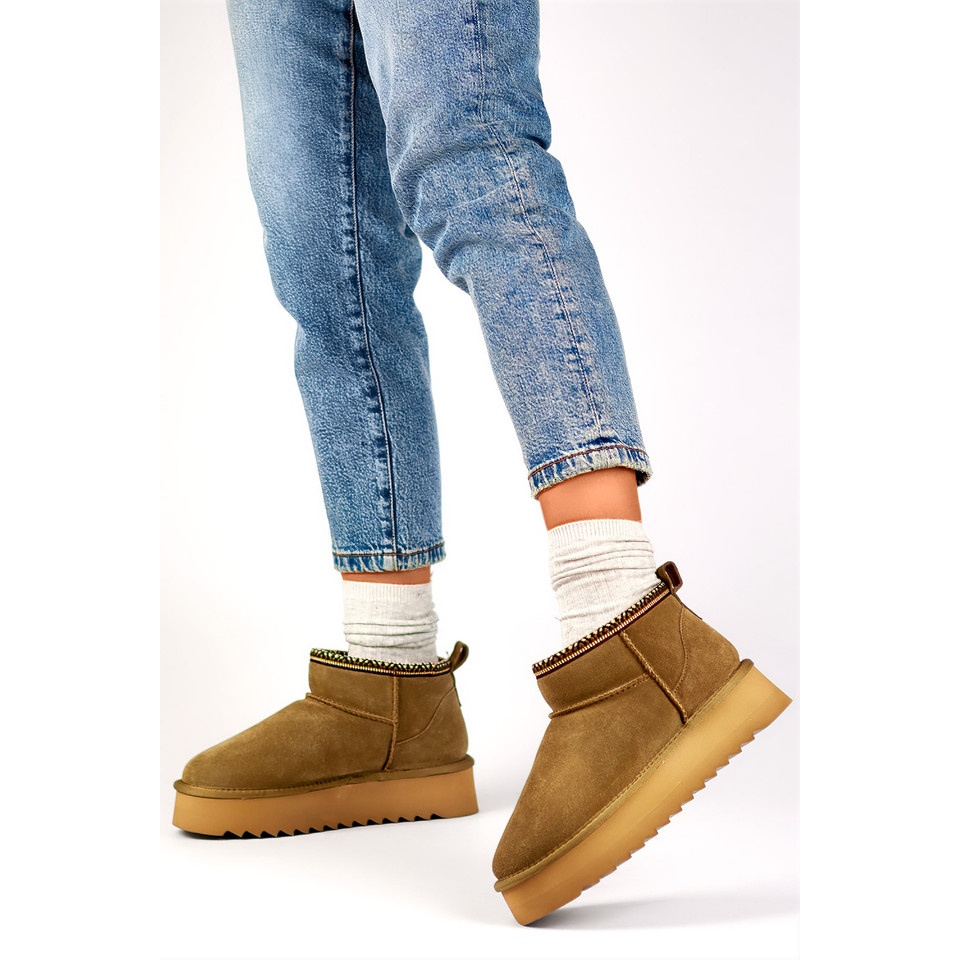 Upptäck en perfekt kombination av stil och komfort med bruna läder snöstövlar som stövlar. Dessa unika skor, gjorda av naturligt mocka läder, är det perfekta valet för svala vinterdagar. Höjden på den övre av 10 cm ger tillräckligt stöd, och isolering med eko -päls skyddar mot kyla, samtidigt som den garanterar termisk komfort.
