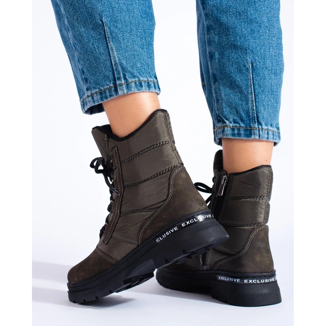 Snygga och bekväma kvinnors snöstövlar snörda i en modern grön färg - perfekt för svalare dagar. Kombinationen av ekologiska mocka och ekologiska hudelement garanterar en elegant utseende med en ekologisk inställning till material. Uppvärmning och en textilinsula säkerställer termisk komfort, och en solid syntetisk sula med slitbanan ger god vidhäftning på snöiga och våta ytor.