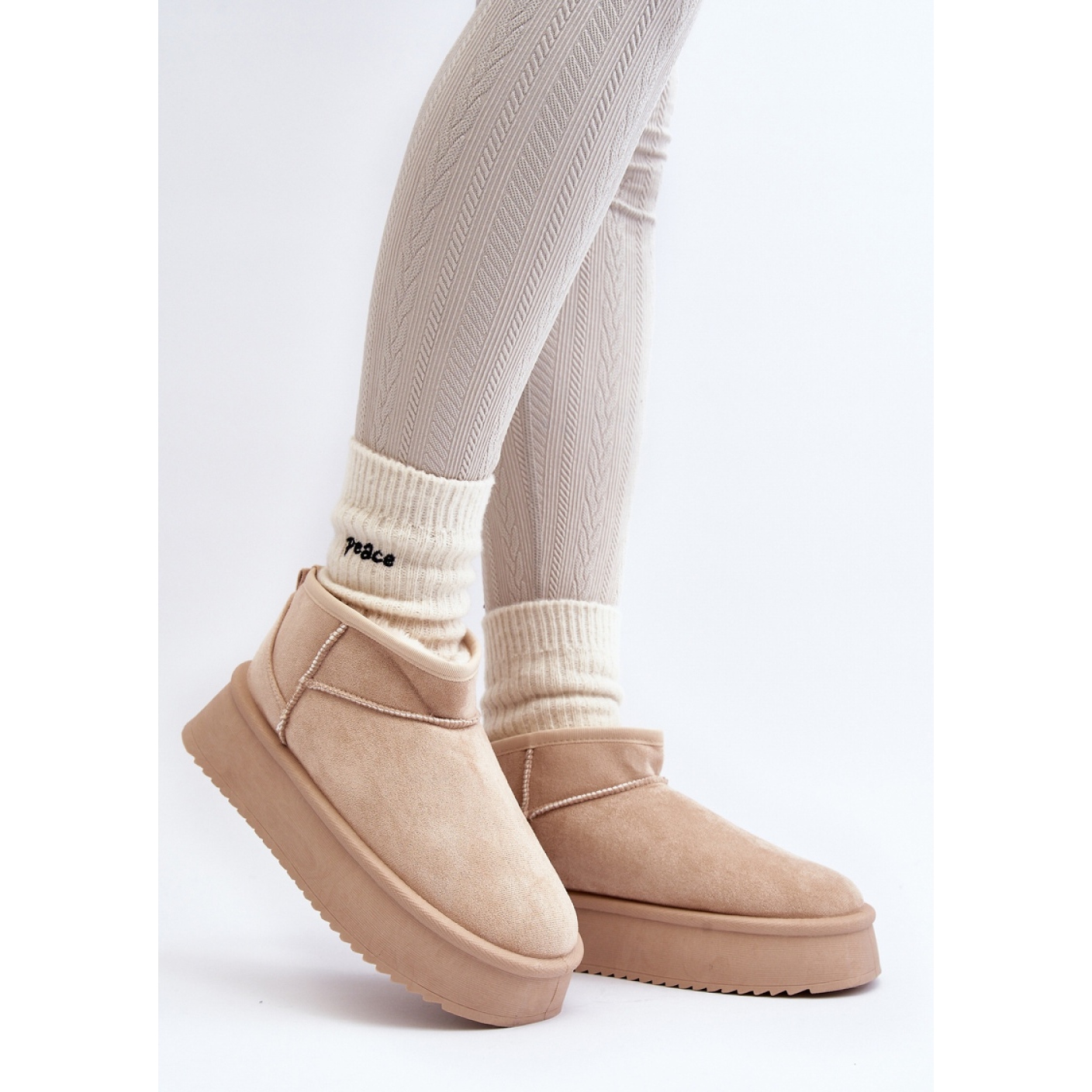 Skorna inre är fodrad med tjock päls, vilket ytterligare ökar deras komfort och mysighet. Denna modell är perfekt för olika stiliseringar - från dagliga kläder till mer eleganta uppsättningar. Beige färg gör att snöfiskar enkelt anpassar sig till olika kläder.