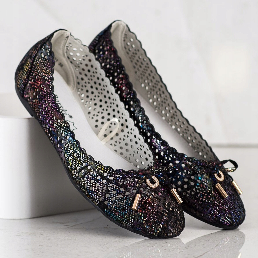 Snygga genombrutna flerfärgade balettlägenheter från S. BARSKA är ett idealiskt förslag för kvinnor som letar efter komfort och elegans för vår- och sommardagar. Dessa moderna balettlägenheter kännetecknas av sin unika design - ovandelen är täckt med ett genombrutet mönster i svarta nyanser som skimrar i solen, vilket skapar en spektakulär, färgstark effekt.