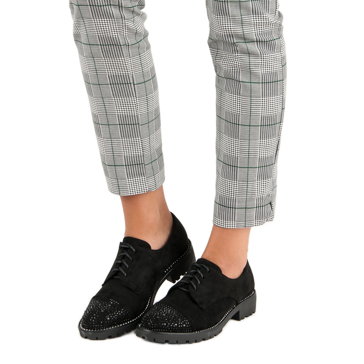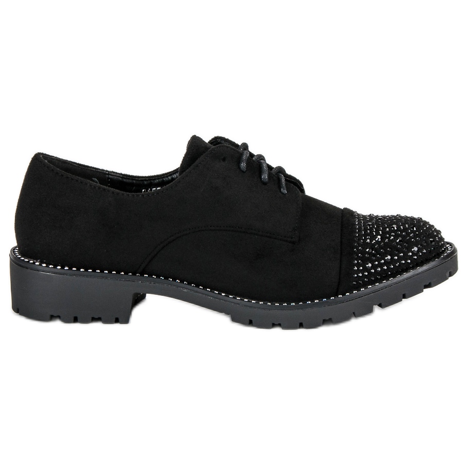 Denna modell kombinerar klassisk design med fashionabla accenter - iögonfallande kristaller placeras på näsan och i den övre delen av plattformen, vilket ger dem en unik karaktär. En platt 3,5 cm hög klack garanterar komfort, och snörning ger en exakt passform av skorna till foten.