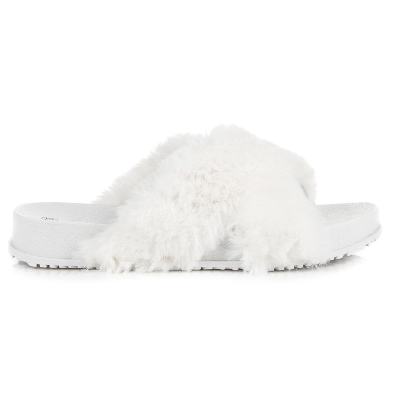 Slitbanan i minimalistisk stil, utan några mönster, gör att du enkelt kan matcha flip-flops till olika stilar - från hemmet till vardagsutflykter. Vita flip-flops med päls är ett måste i varje kvinnas garderob, vilket tillför lätthet och fräschör till din styling.