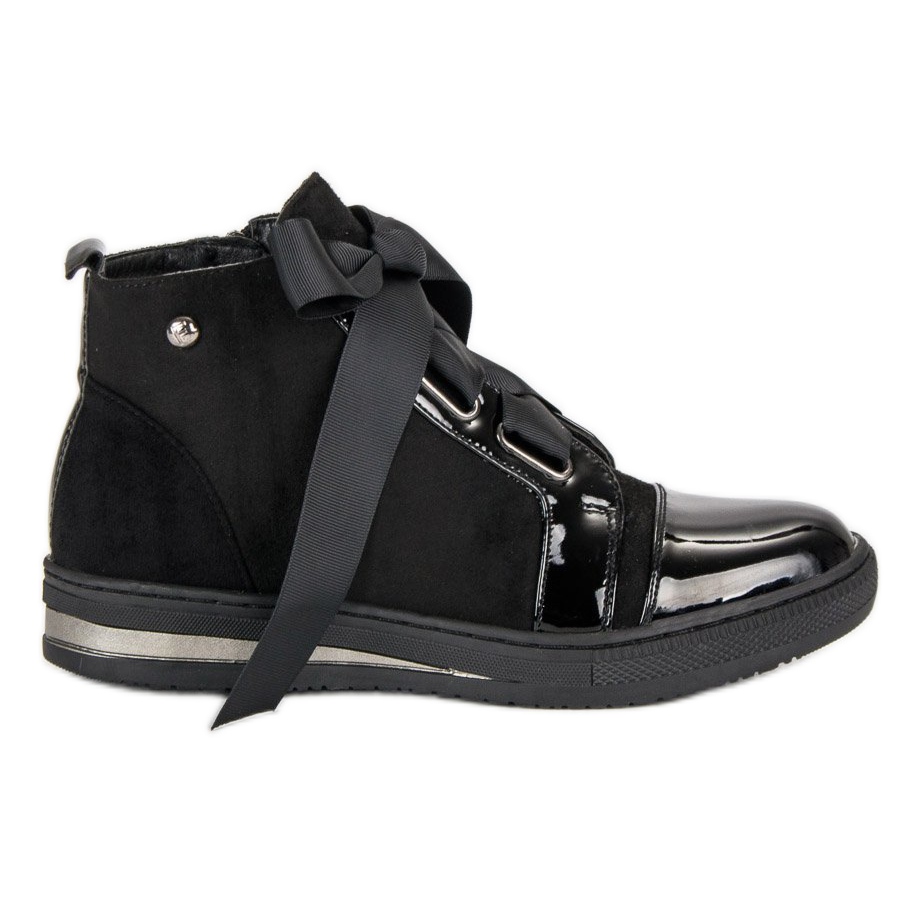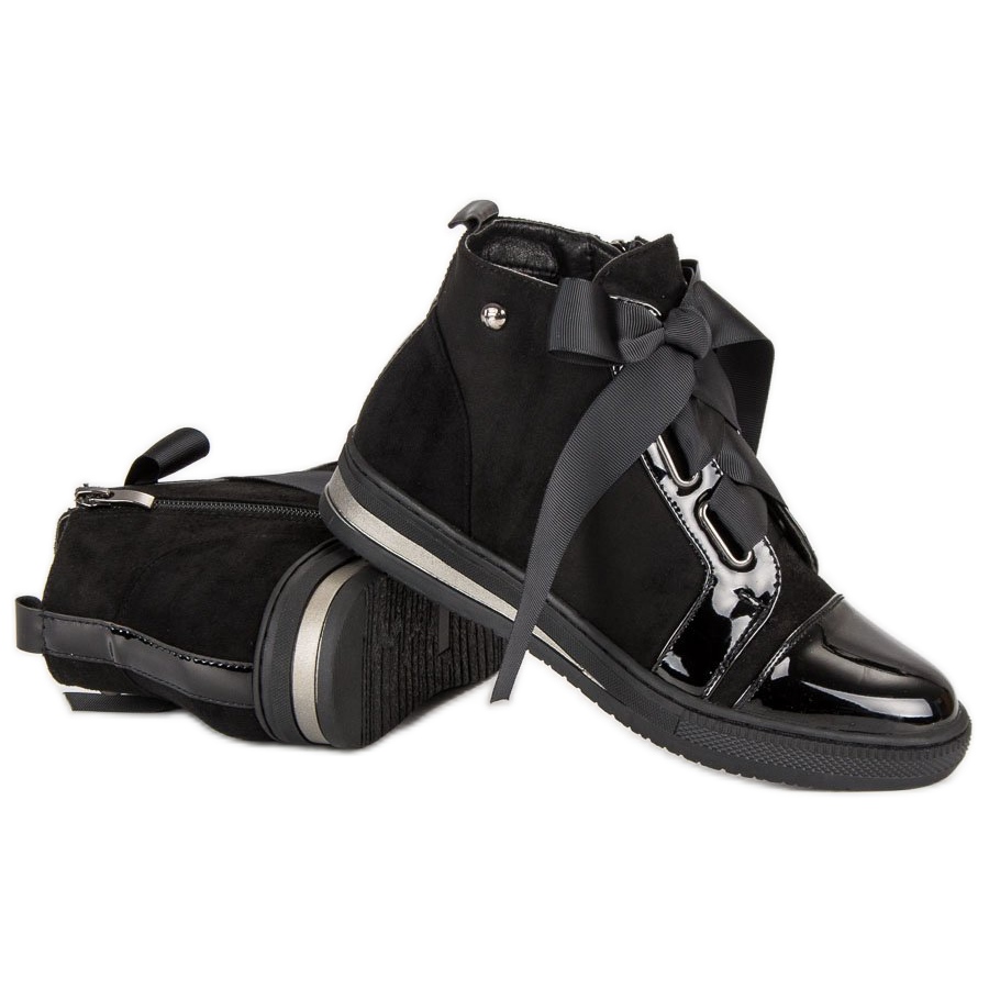 Det här är snygga high-top sneakers från Filippo, som kombinerar elegans och sportig avslappnad, perfekta för vardagsbruk. Dessa svarta skor, gjorda av en kombination av lack och mocka, är perfekta för alla årstider. Den pälsfodrade interiören säkerställer termisk komfort, vilket gör dem till ett perfekt val för höst och vinter.