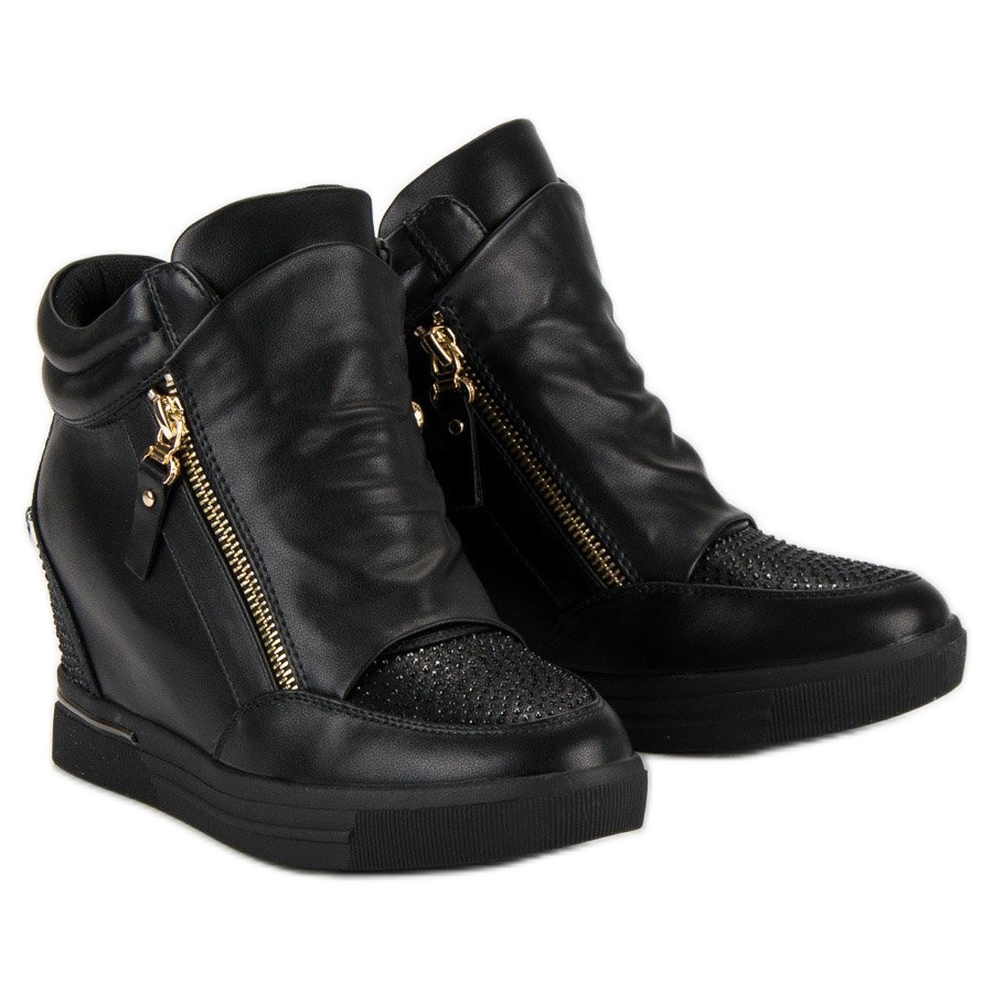 Fashionabla svarta sneakers är utrustade med en praktisk dragkedja, vilket gör dem lätta att ta på. En ytterligare dekoration är rhinestones i form av kristaller placerade på skons tå och häl, vilket lockar uppmärksamhet och betonar deras unika karaktär. Gummit som används i sulan säkerställer tillräckligt grepp, och den lätta konstruktionen gör den bekväm att bära hela dagen.