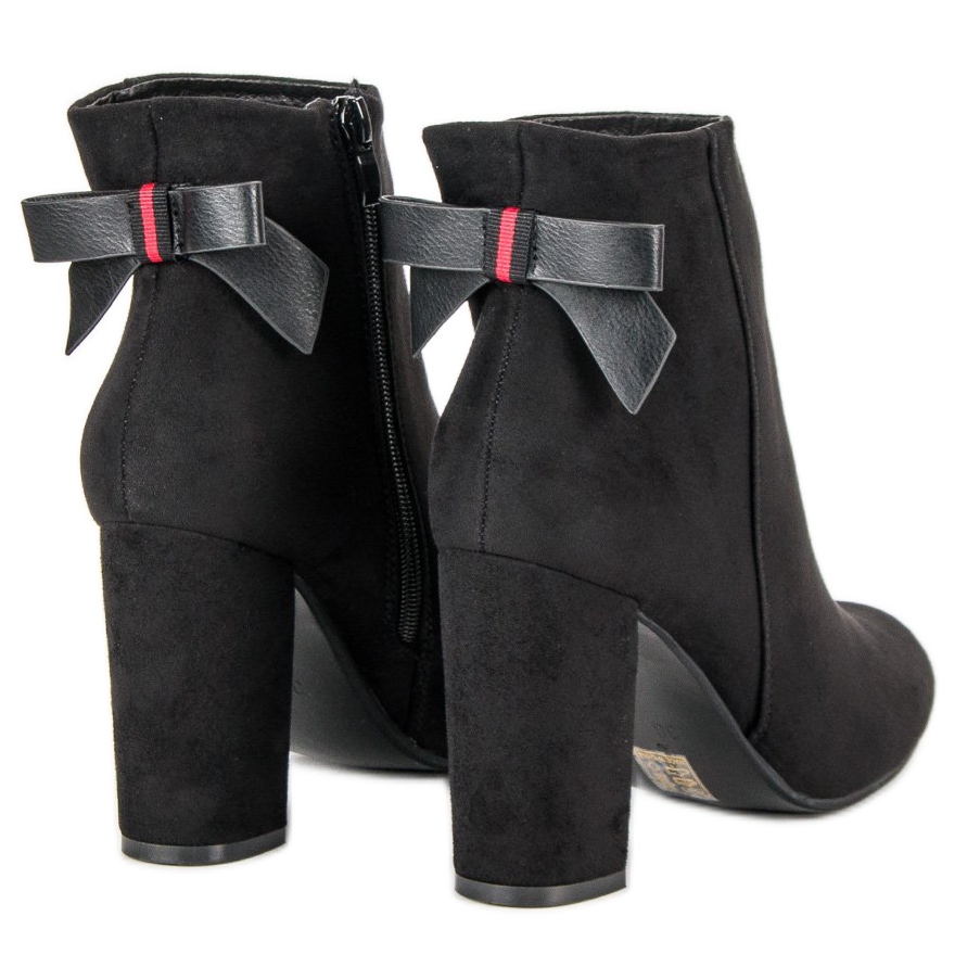 En hög, 9,5 cm tjock klack i form av ett block ger stabilitet och komfort att bära hela dagen. En ytterligare fördel är bågen som dekorerar skorna, vilket ger dem en subtil, feminin accent. De svarta stövlarna har en rund tå vilket gör dem bekväma och lämpliga att bära under lång tid.
