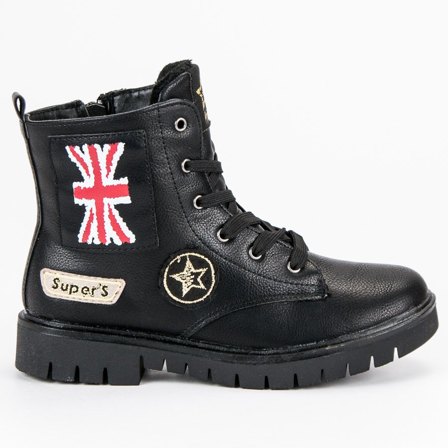 American Club - snygga, svarta ankelboots för tjejer som kombinerar en rockig karaktär med vardagskomfort. Tillverkade av ekologiskt läder, med en bovver-stövlar-stil, lockar de uppmärksamhet med patchar och ett moderikt snitt - perfekt för tjejer som gillar att sticka ut under kallare dagar.