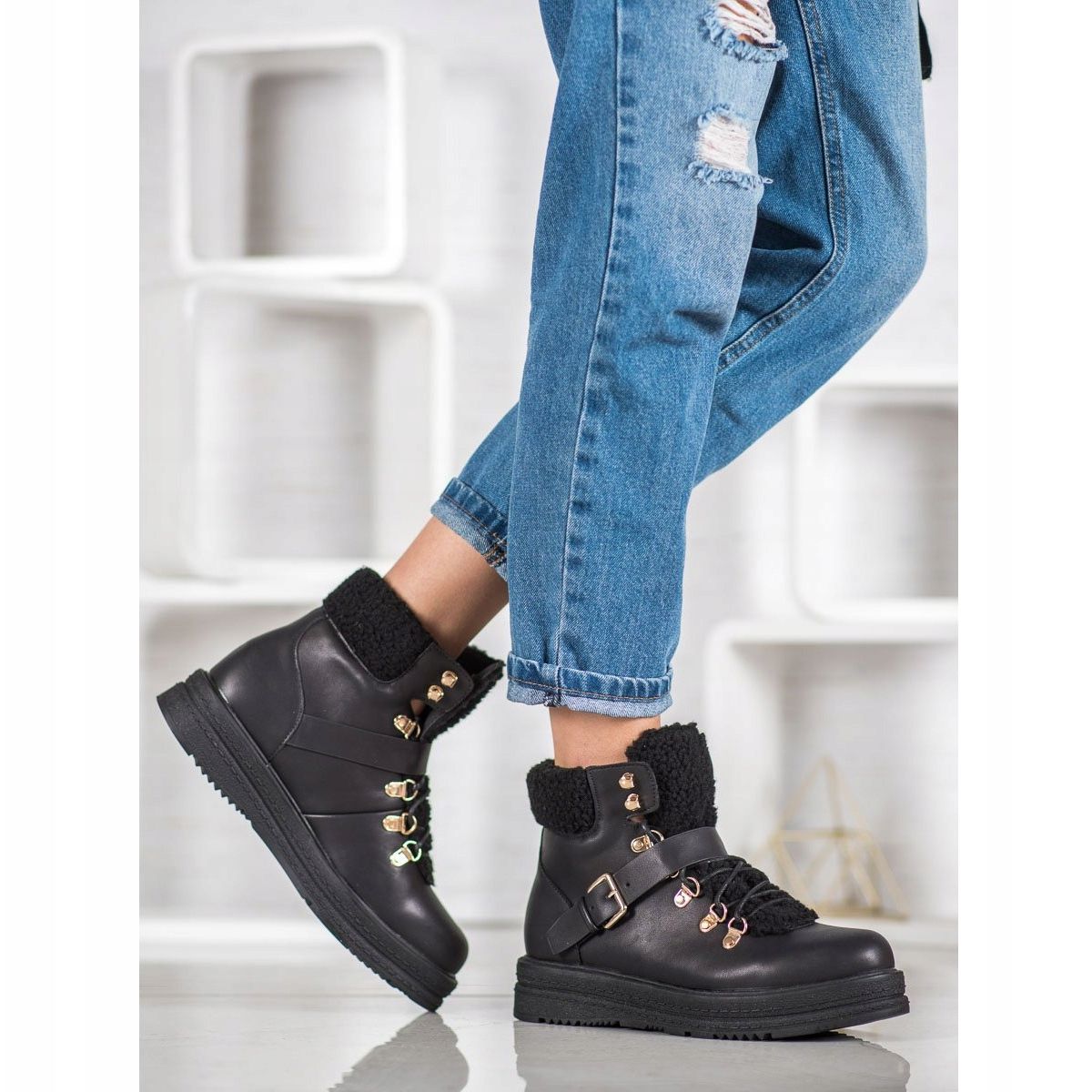 Stövlarna har snörning, tack vare vilken de kan anpassas perfekt till formen på foten, vilket garanterar komforten att bära. Säkrade med en fårskinnsrock på ovansidan och ett dekorativt spänne, drar de till sig uppmärksamhet och ger karaktär till varje styling. Sulan med slitbana säkerställer stabilitet och komfort under gång, och hälhöjden på 3-5 cm underlättar långvarig användning utan att känna sig trött.