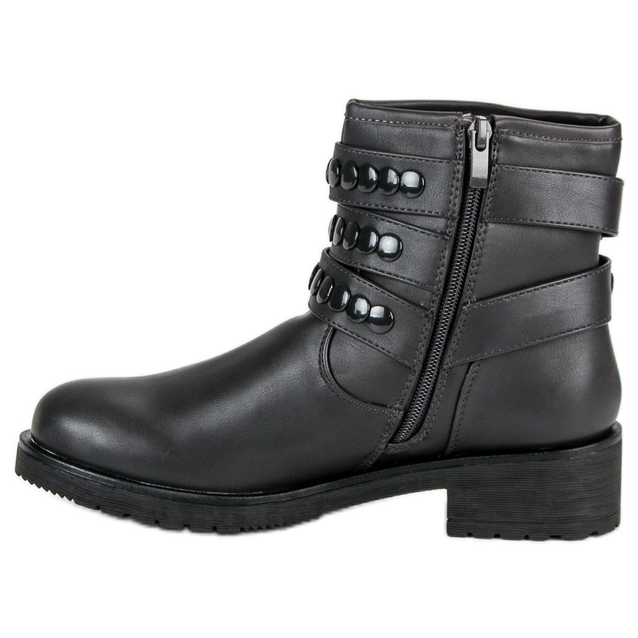 Den övre delen av stövlarna, som når över ankeln, är dekorerad med fashionabla remmar med spännen och stora strass, vilket ger dem en rockig och unik stil. Tack vare pälsisolering och ett inlägg med en skofilt är dessa arbetare perfekta under kallare dagar och ger värme och komfort.