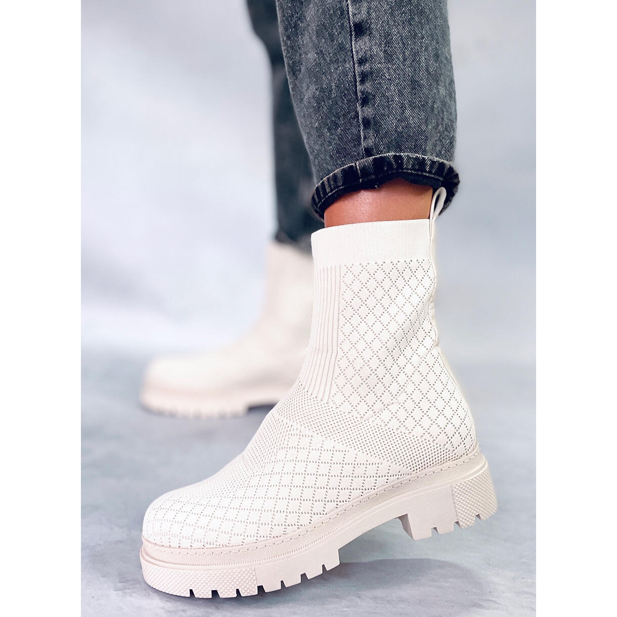 Moderna Raeda Beige Sock-stövlar från Keeshoes-samlingen till ett måste-ha denna säsong. Tillverkad av flexibelt tyg med ett subtilt, öppet motiv motiv, de anpassar sig perfekt till benet och skapar effekten av "strumpor". Ankelmodellen, på en platt, hög sula (plattform/3,5 cm häl) med en rundad tå. Interiören är delvis isolerad med delikat päls, vilket säkerställer termisk komfort och trevlig användning på svalare dagar.