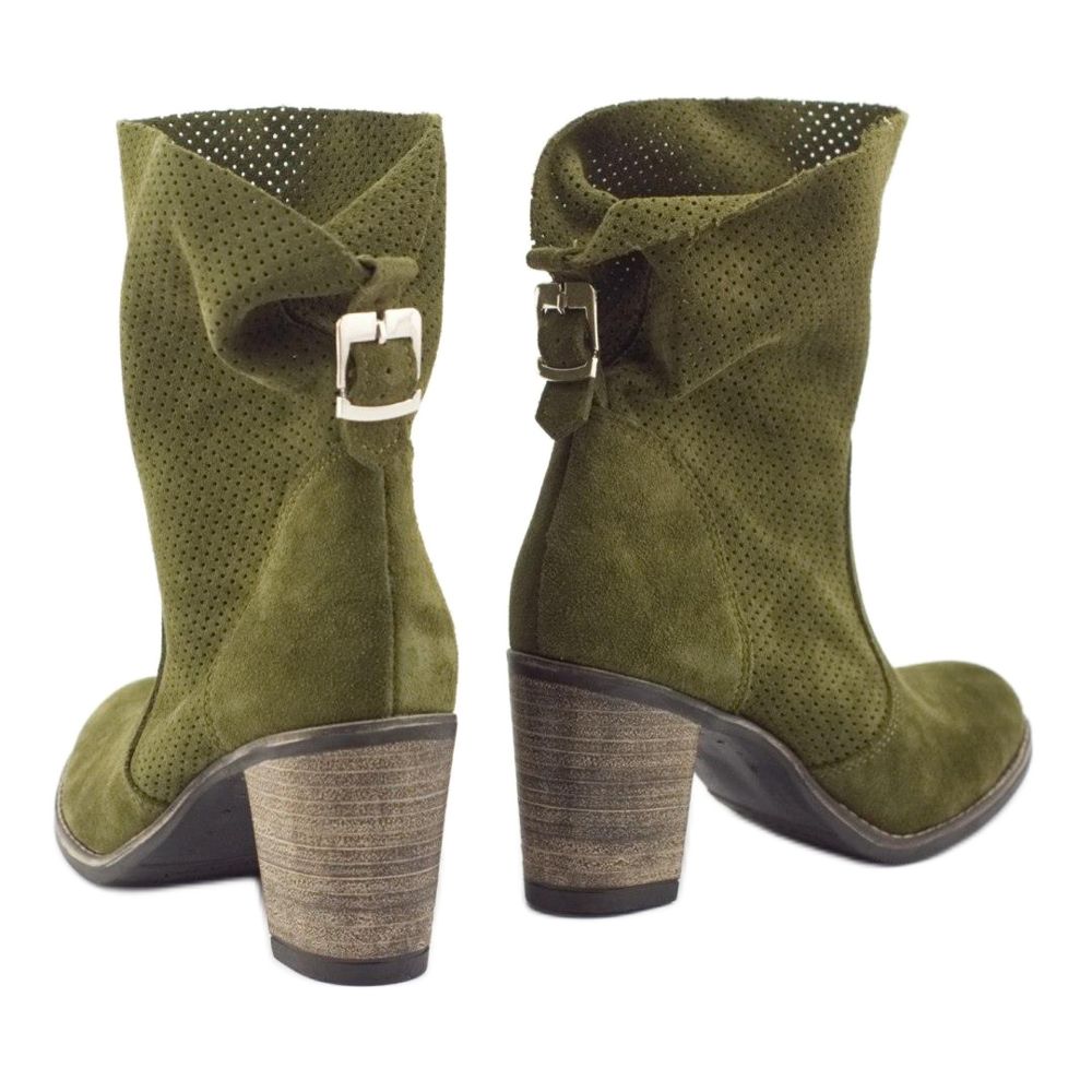 Tillverkade av högkvalitativt naturligt läder, både in- och utvändigt, garanterar kängorna komfort och andningsförmåga. Mjuk nubuck i en subtil nyans av oliv anpassar sig till formen på benen och genombrutna detaljer ger dem en unik karaktär. Den ankellånga ovandelen och den runda tån framhäver deras feminina stil och dragkedjan gör dem lätta att ta av och på.