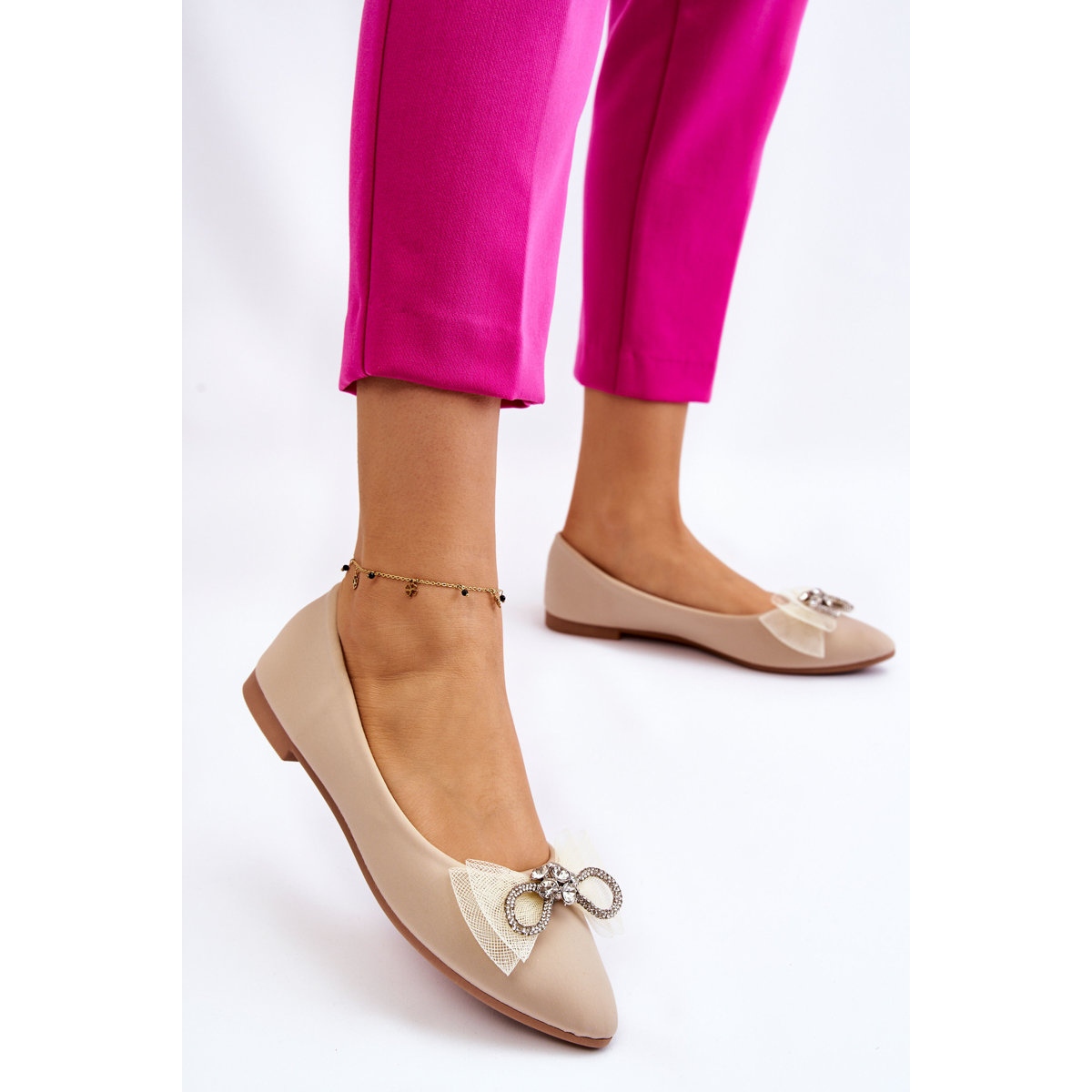 Detaljer: Spetsiga ballerinor för kvinnor med en dekorativ rosett Beige Lysande