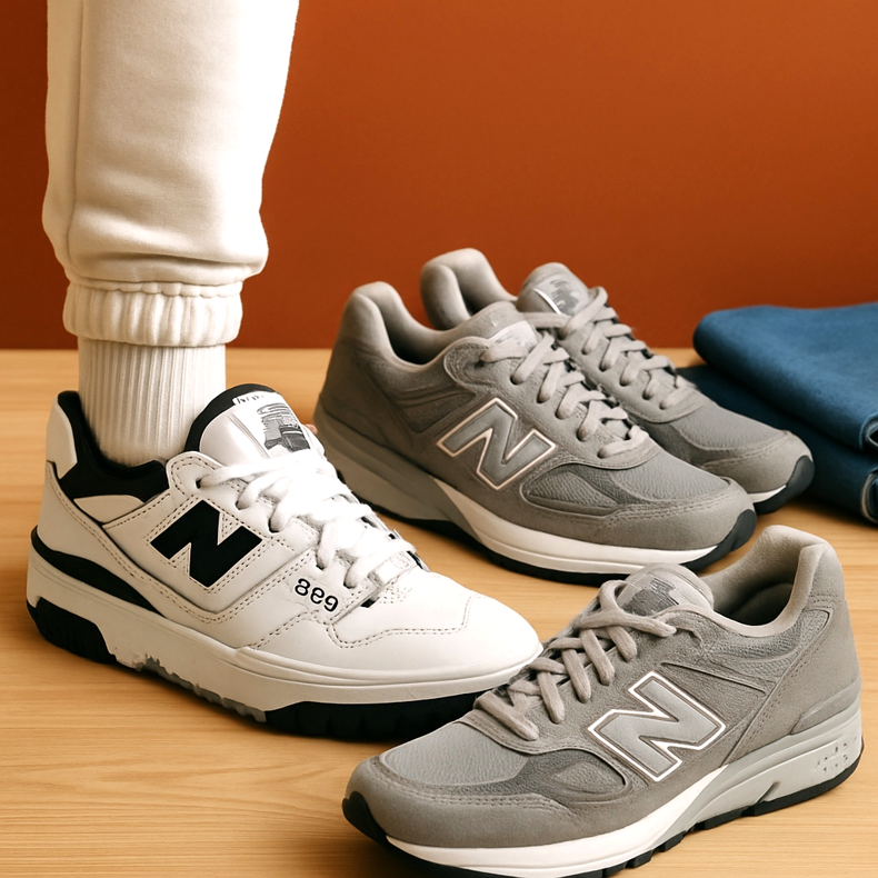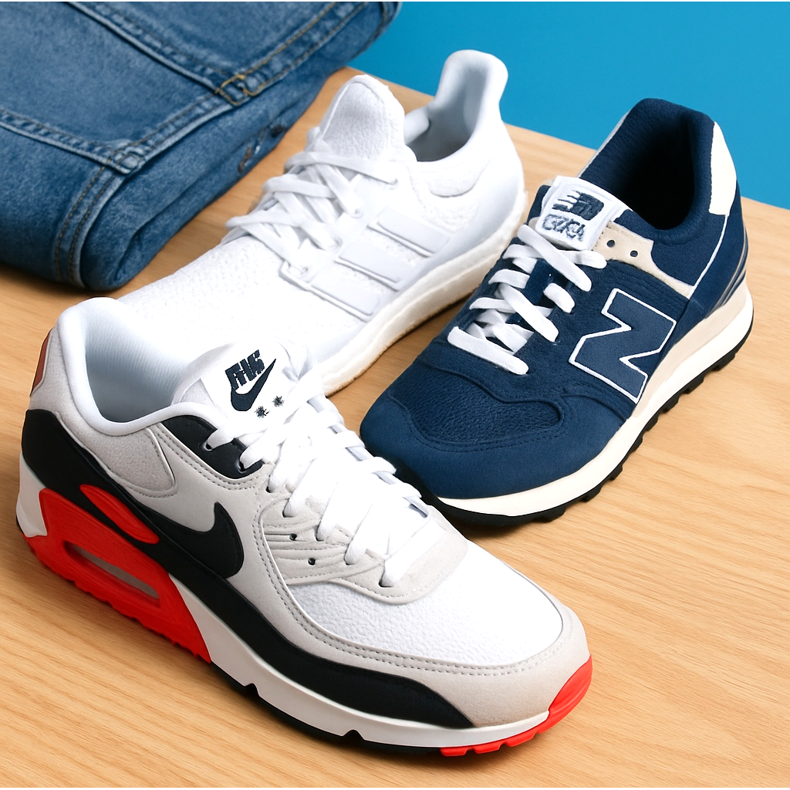 Air Max 90 (grå/vit), New Balance 550 (vit/grå), Ultraboost (svart/grå). Casual, bekväm, universell.