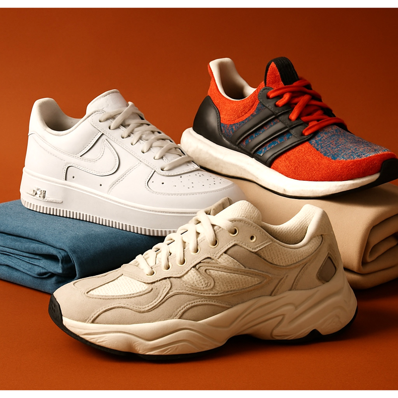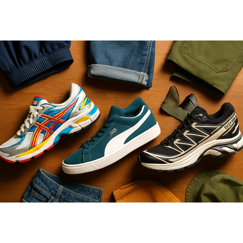 Utilitaristisk, streetwear-stämning. Chunky sneakers (Air Max, New Balance, Salomon) är perfekta för last.