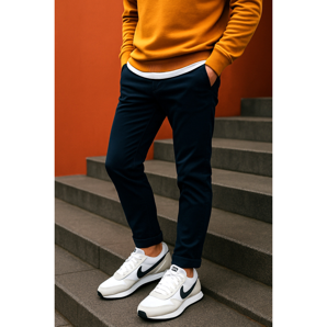 Smart casual - chinos + minimalistiska sportskor (Stan Smith, vit AF1, Ultraboost i dämpade färger) ser eleganta och bekväma ut.