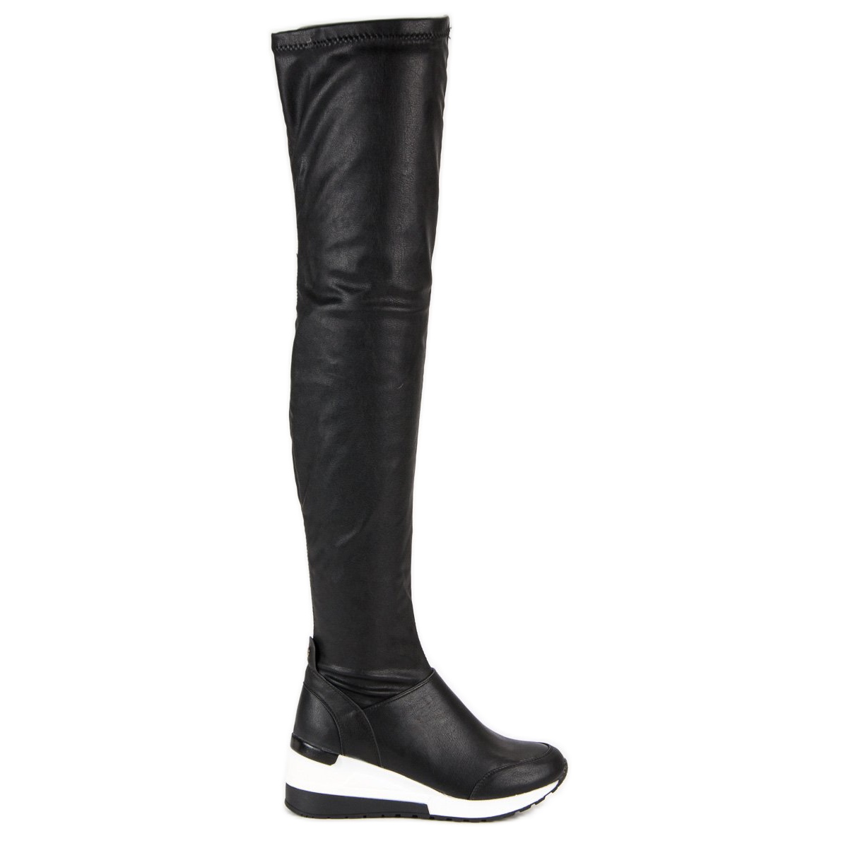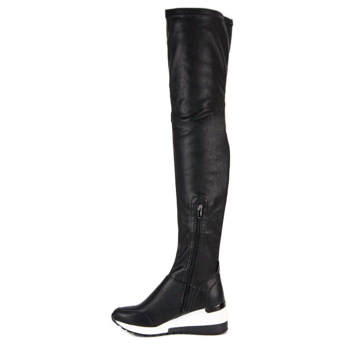 Over-the-knee boots framhäver den kvinnliga figuren och ger den en sexig karaktär. Tillverkade av högkvalitativt svart läder, de är inte bara snygga, utan också mycket lättskötta, vilket gör dem till ett oersättligt inslag i din garderob.