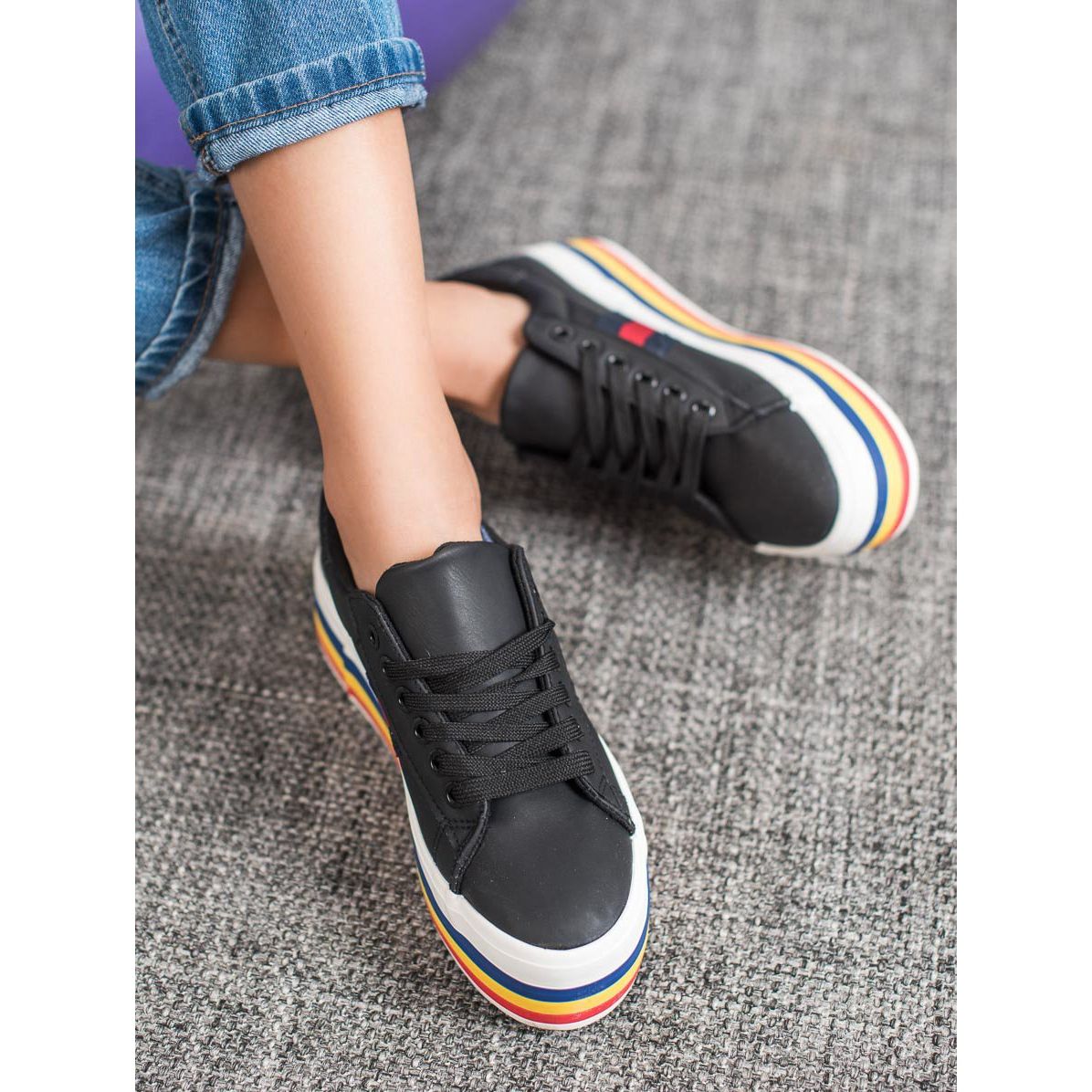 Upptäck extraordinära sportskor med hög plattform från SHELOVET som perfekt kombinerar stil och komfort. Dessa svarta flerfärgade sneakers har en unik design tack vare färgglada ränder på sulan, vilket gör dem till ett bra komplement till en mängd olika vardagskläder.