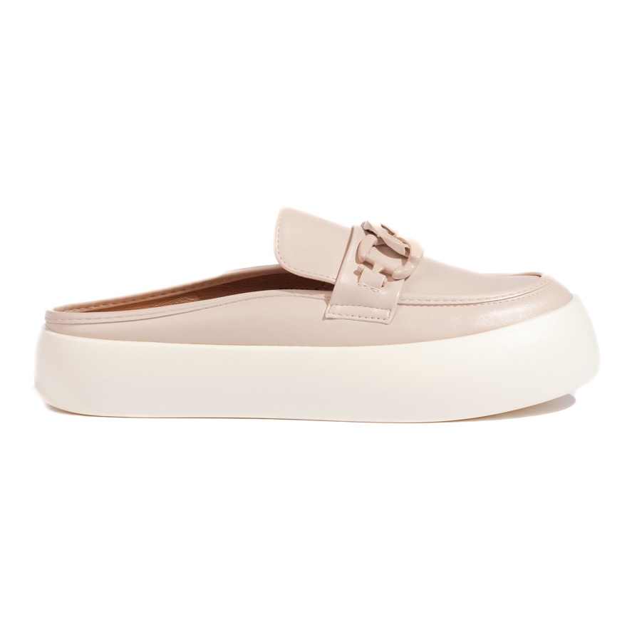 Tillverkad av högkvalitativt ekologiskt läder, både det yttre och inre skiktet säkerställer hållbarhet och lätthet att bibehålla. Dessutom gör en bekväm ekologisk läderinsats varje steg bekväm och trevlig. En ytterligare fördel är detaljerna i form av en kedja, som ger klaffarna en fashionabla karaktär.