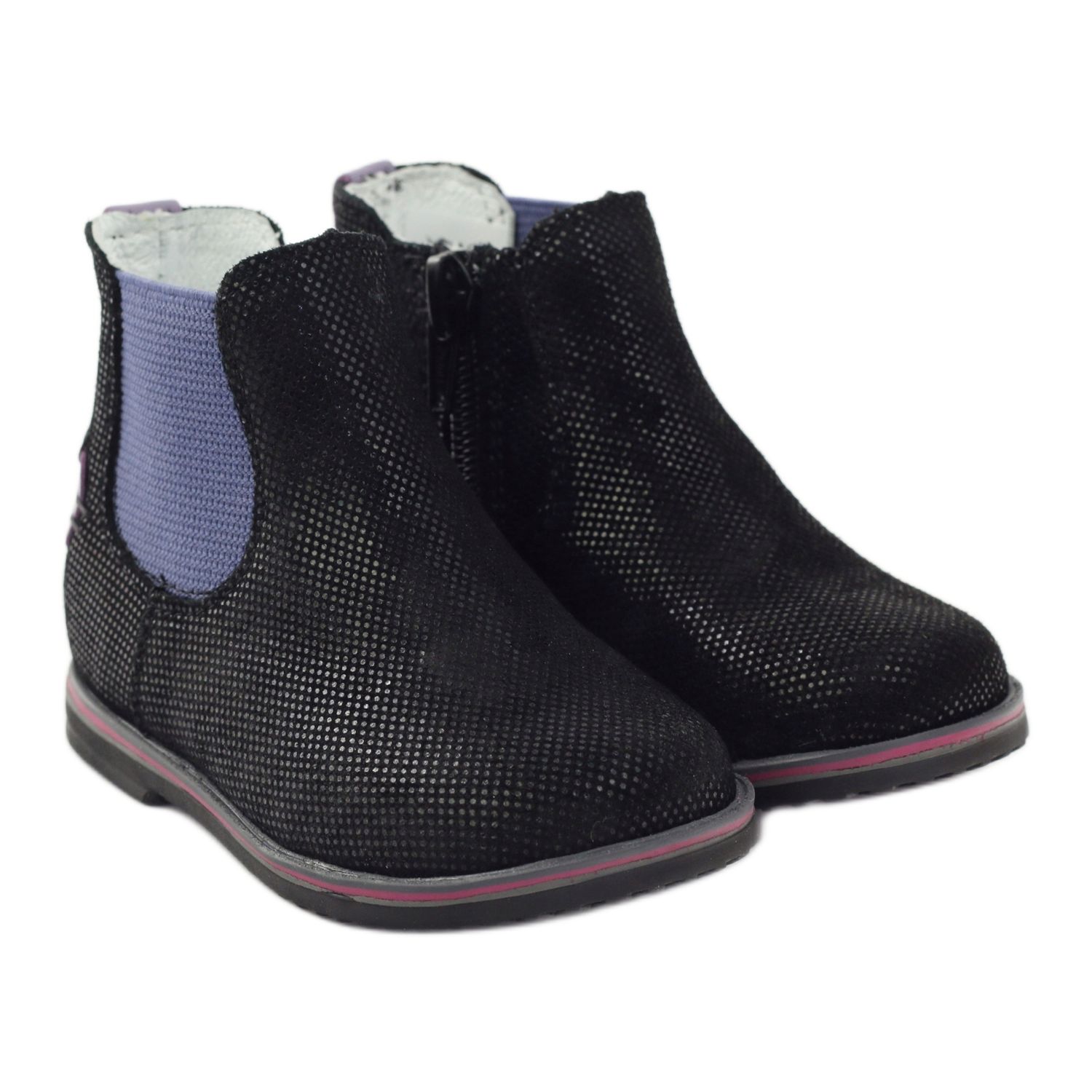 Stövlarna ger ordentligt stöd för den unga foten tack vare den styvade hälen och profilerade innersulan. Naturmaterial ökar användarkomforten och andningsförmågan, och den antibakteriella insatsen säkerställer hygienen. Blixtlåset på sidan gör vardagen enklare, och den universella svarta färgen med lila accent kommer att fungera bra med många skol- och feststilar.