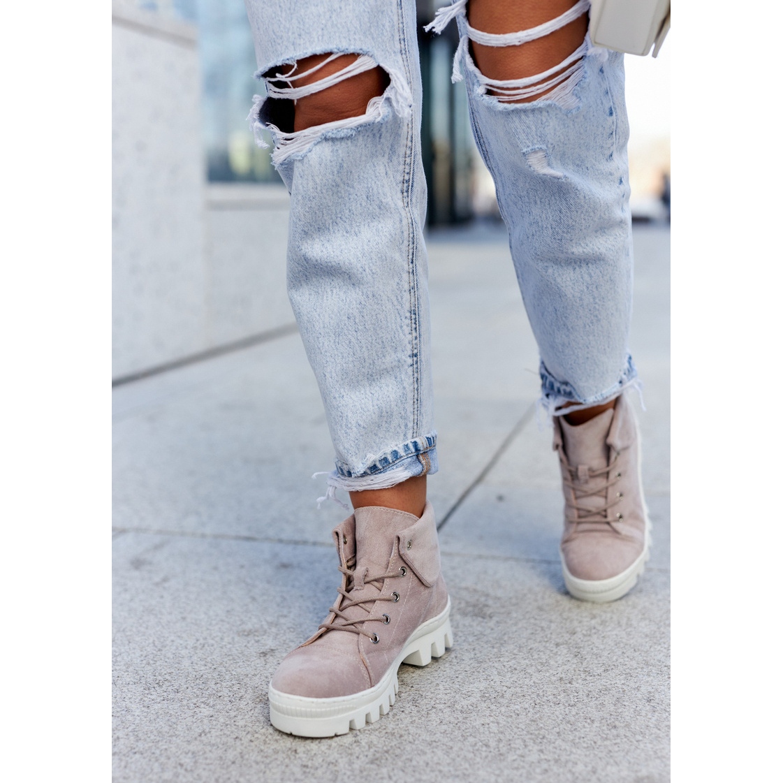 Snygga och bekväma stövlar som kommer att ge karaktär till avslappnade uppsättningar. Tillverkad av ekologisk mocka i en fashionabel, lätt spola. Ställ på en tjock, skuren sula, med en rundad, stelad näsa och snörning för runda snören. Den övre når vristen och rullas upp något, vilket betonas av deras stad, informell karaktär.