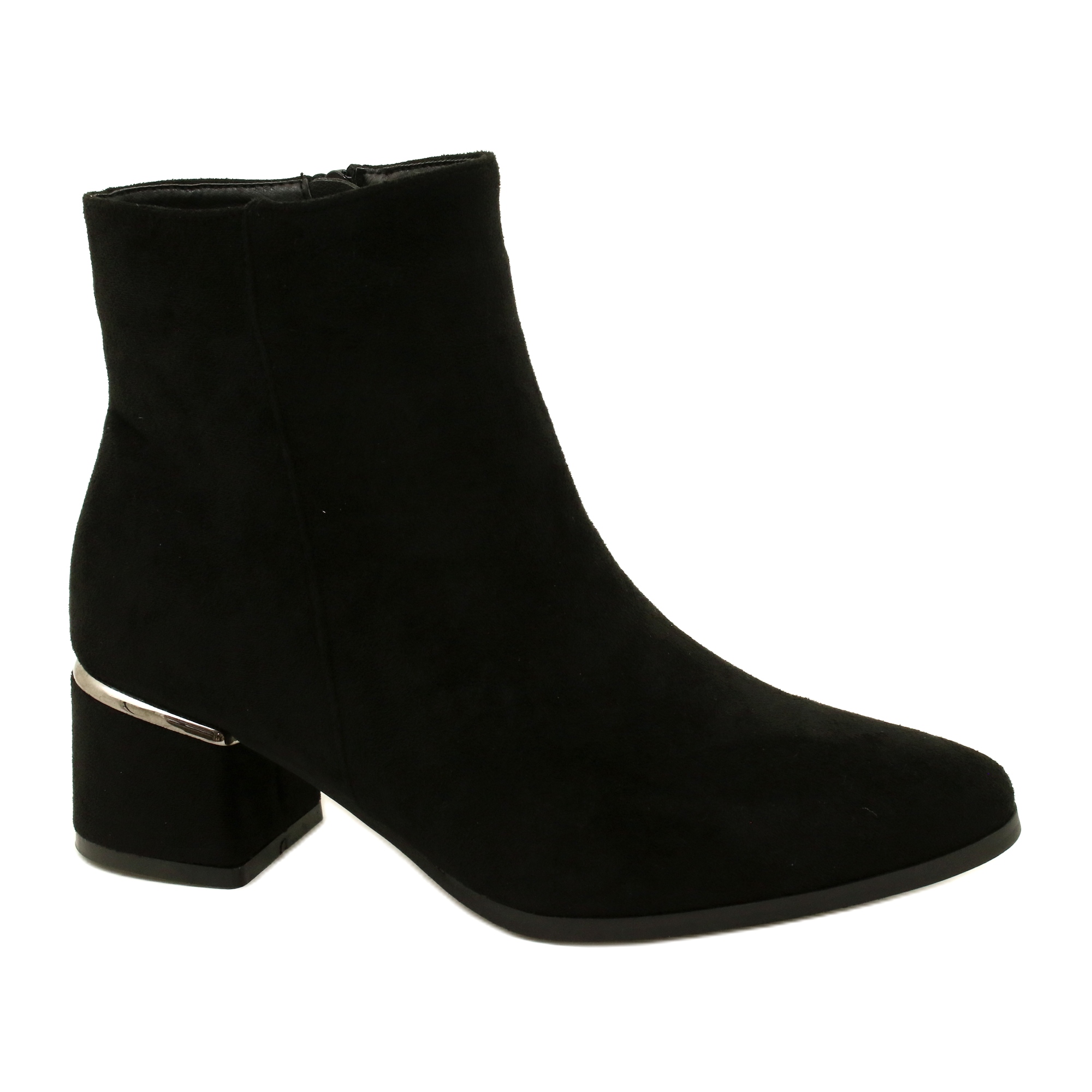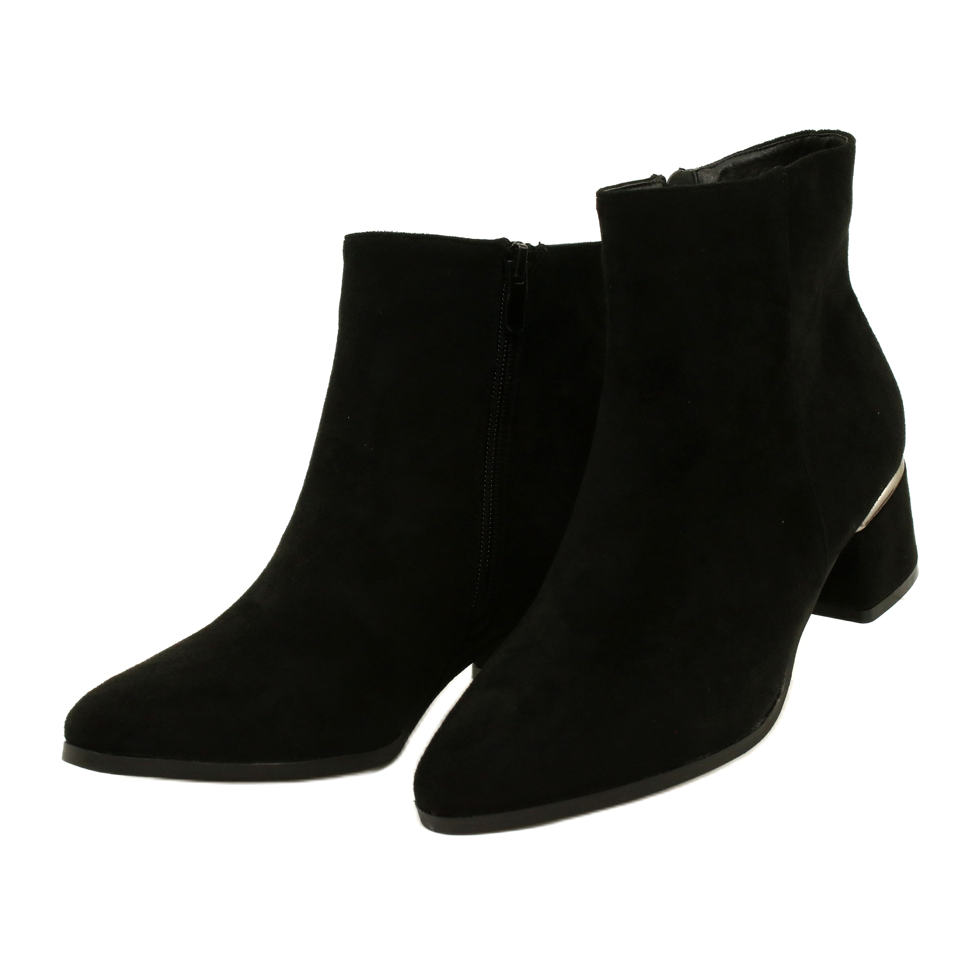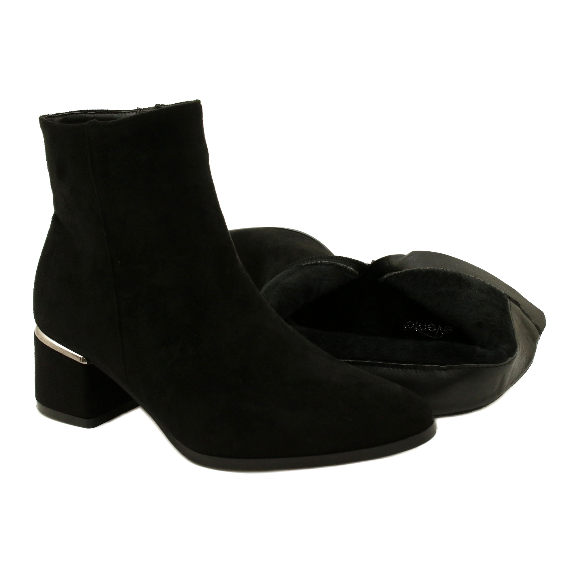Klassiska och eleganta kvinnors Elevento -stövlar som kombinerar stil med komfort. Tillverkade av ekologiskt läder med mocka struktur i en universell svart färg, de är perfekta för både formella och vardagliga stiliseringar. Den 5 cm höga posten tillför kvinnlighet och säkerställer samtidigt att ha stabilitet. Den dragkedjiga modellen underlättar att sätta på, och den spektakulära silverdekorationen betonar subtilt skorna.