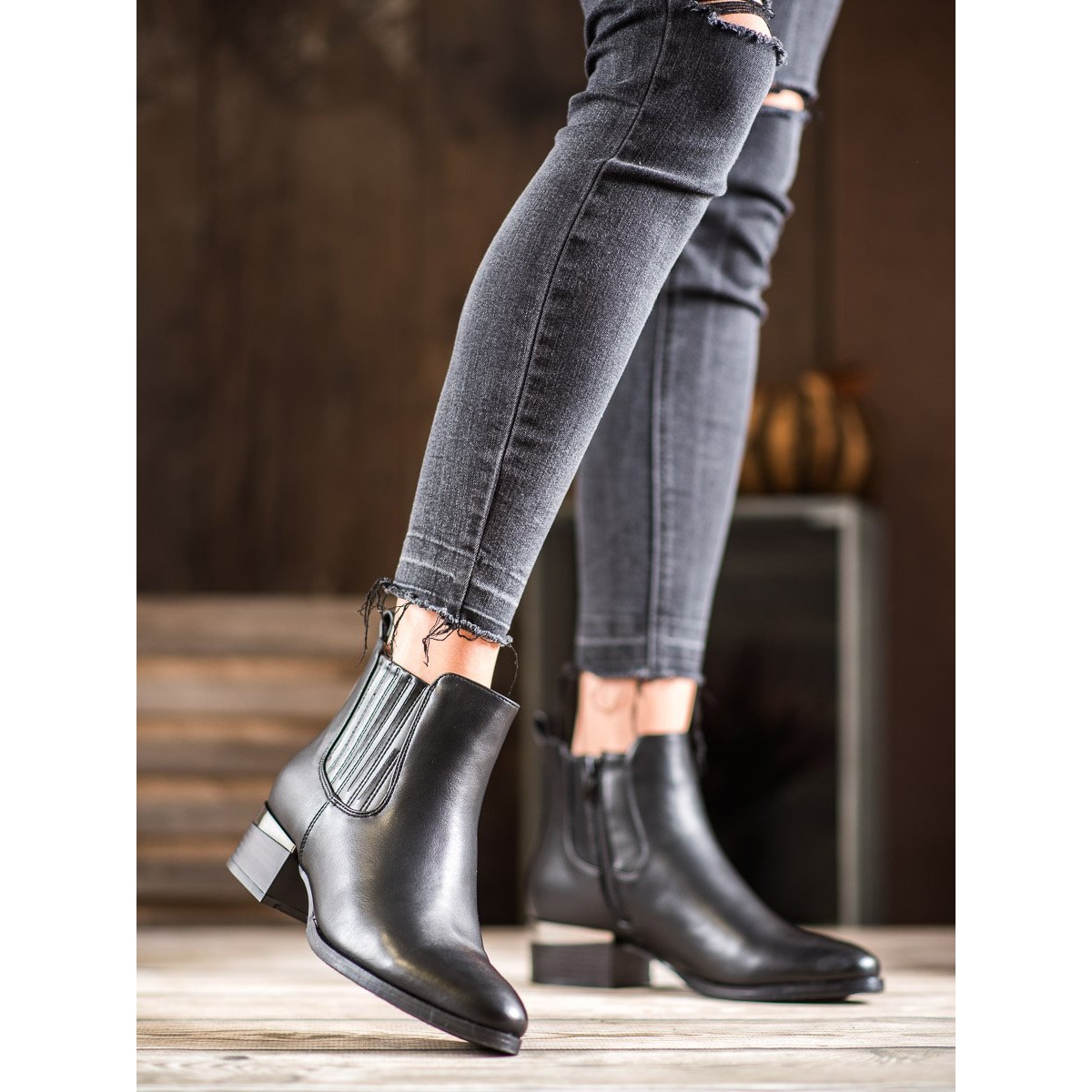 Super Mode ankelboots med dekorativ klack är ett perfekt val för varje kvinna som letar efter snygga och bekväma skor för kallare dagar. Tillverkade av högkvalitativt ekologiskt läder, de kombinerar perfekt elegans med vardagskomfort. Svarta ovandelar når över ankeln, vilket gör dem till ett perfekt komplement till olika stilar - från avslappnad till mer elegant.