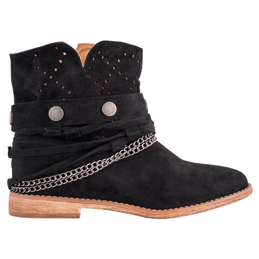 Stövlarna har en platt men snygg 7,5 cm dold kil, som ger lite höjd utan att ge avkall på komforten. Tack vare den övre räckvidden ovanför ankeln och utrustad med dekorativa kedjor och tygremsor får du inte bara ett moderikt utan också unikt utseende.