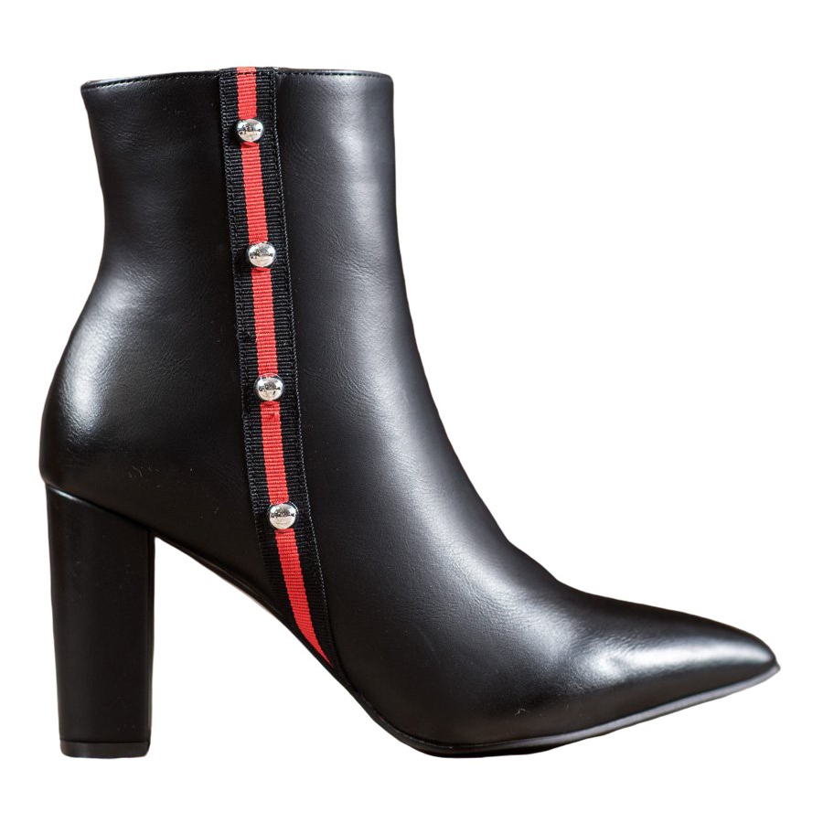 Stövlarna kännetecknas av spetsiga tår och en stabil 8,5-centimeters blockklack, vilket säkerställer inte bara ett moderiktigt utseende, utan även komfort när de bärs. Tillverkade av högkvalitativt ekologiskt läder, med strass och en dekorativ svart och röd rand, ger de karaktär och unik charm till varje styling.