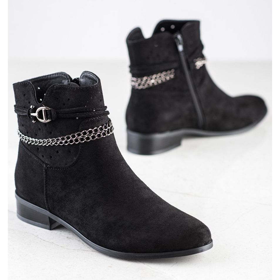 VINCEZA ankelboots med en dekorativ kedja i svart är ett idealiskt val för kvinnor som värdesätter elegans och komfort i vardagsbruk. De är gjorda av högkvalitativ mockaimitation och har en stilren och avslappnad karaktär, perfekt för höst/vintersäsongen.
