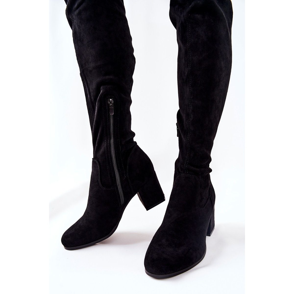 En blockformad häl med en höjd på 6,5 cm säkerställer stabilitet och komfort, och den övre bredden på 18,5 cm gör stövlarna perfekta för olika silhuetter. Tack vare sulan av syntetiskt material är produkterna hållbara och motståndskraftiga mot skador.