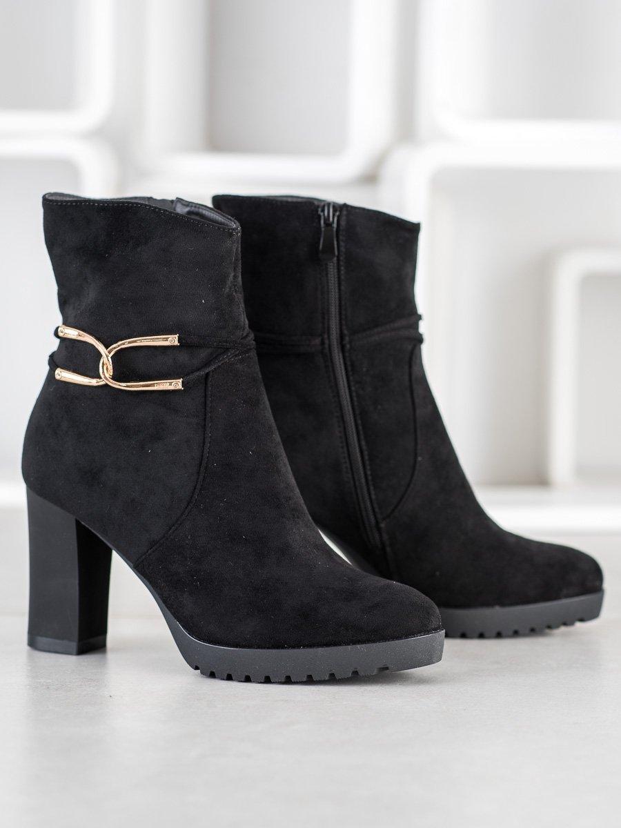 Eleganta kvinnorstövlar som kombinerar stil med vardagens komfort. Black Imitation Suede som betonas med gyllene detaljer kommer att lägga till klass både kväll och avslappnade stiliseringar. En stabil stolpe och en stelad häl säkerställer ett visst steg, och isolering och en profilerad insats tar hand om komfort på svalare dagar.