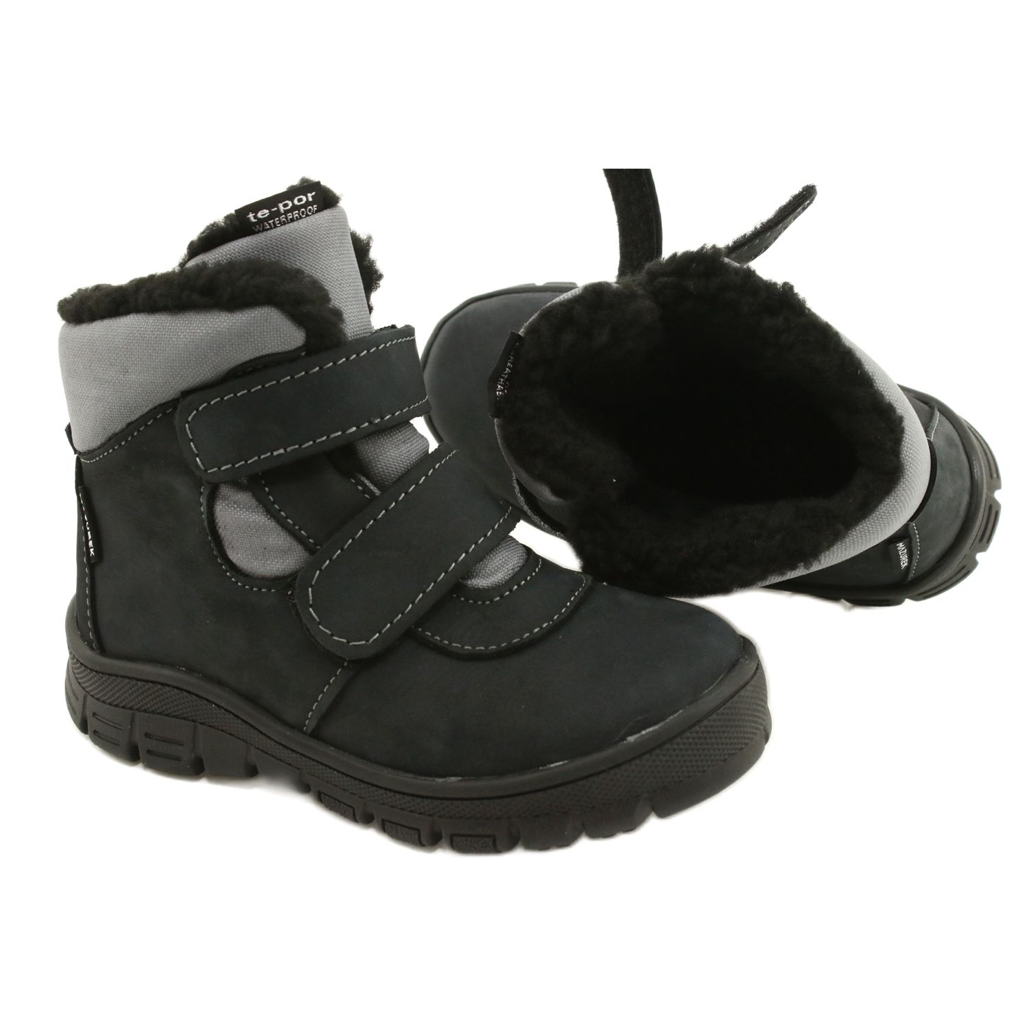 Mazurek 1360 stövlar med membran i antracitfärg är ett idealiskt val för aktiva pojkar som värdesätter komfort och säkerhet. Tillverkade av högkvalitativt naturligt läder kombinerat med material i en moderiktig nyans av svart med en inslag av marinblått, garanterar dessa barnskor vattentäthet och ordentliga förhållanden under vinterpromenader.