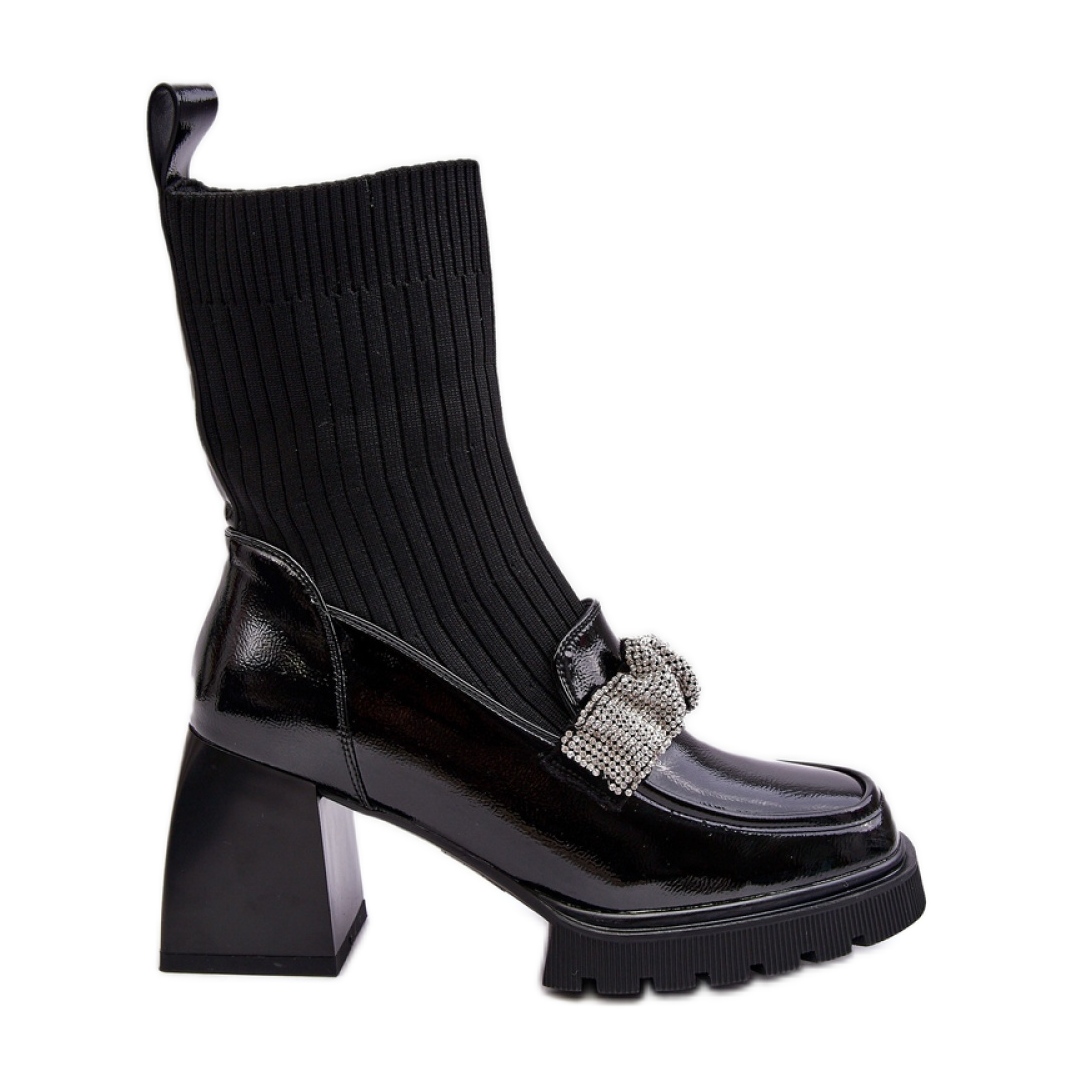 Tillverkade av högkvalitativa ekoläder ger de ett glänsande och elegant utseende som passar perfekt in i nuvarande trender. Den övre i form av en strumpa fäster inte bara perfekt till benet, utan lägger också till en unik karaktär till hela snittet. En ytterligare fördel är smidesremmen med glänsande strass, som fångar ögat och ger skorna originalitet.