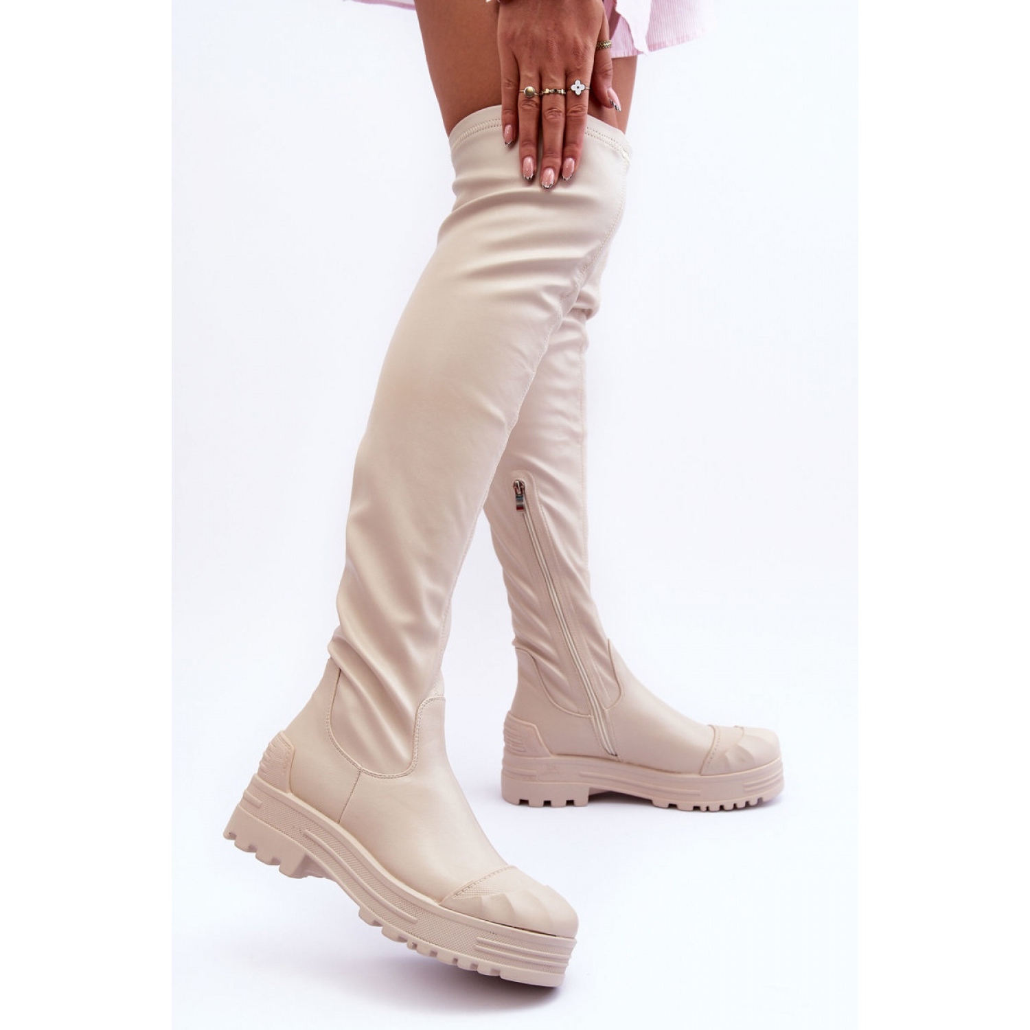 Upptäck elegans och komfort i dudes 15863 höga stövlar i en vacker beige nyans, steget i stilmärke. Dessa snygga stövlar som når över knäet var noggrant gjorda av ekologiskt läder av hög kvalitet, vilket gör dem till ett idealiskt val för älskare av fashionabla och samtidigt etiska lösningar.