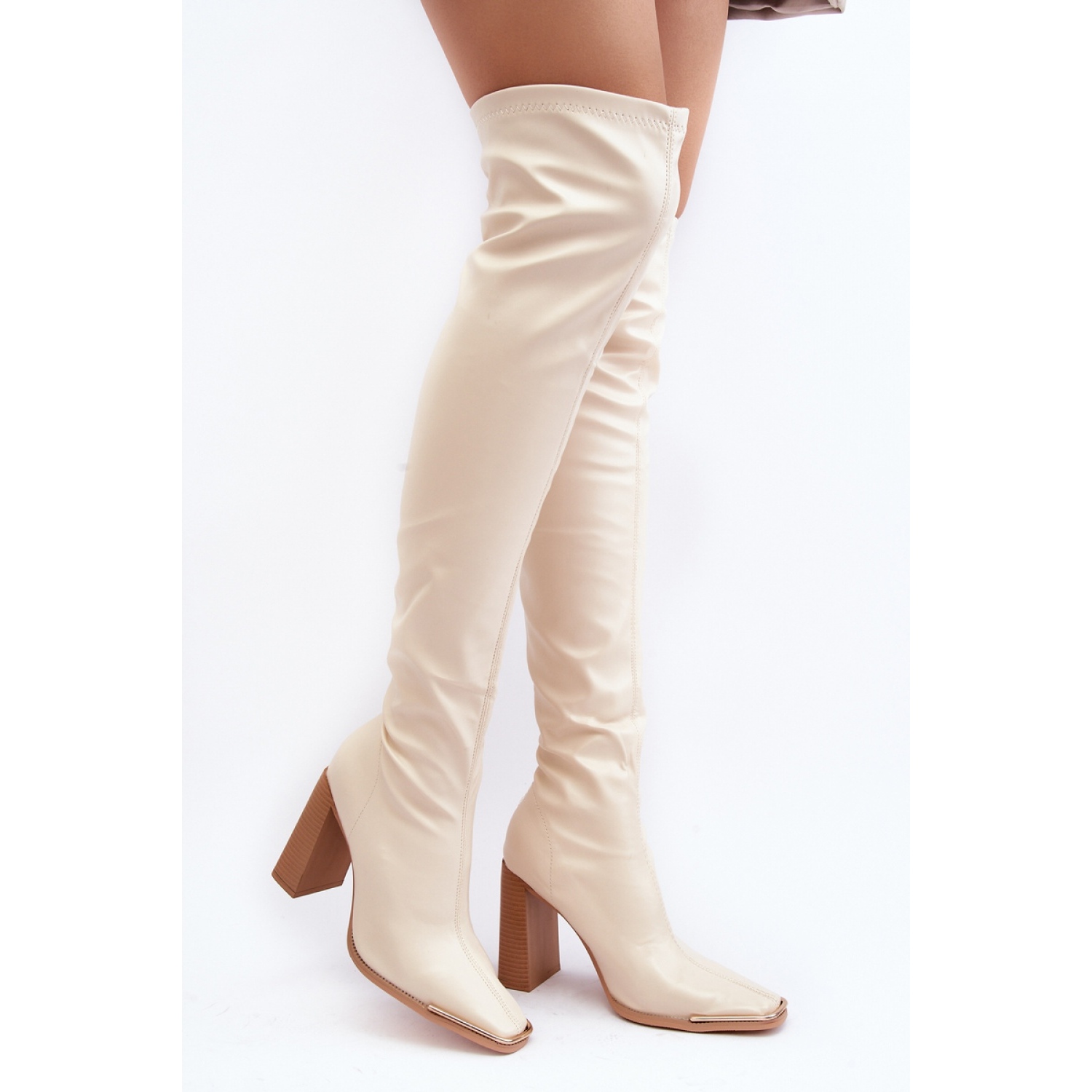 Den höga övre med noggrann sömmar, nå 57 cm, betonar benens form och fyrkantiga tår ger modellen en modern karaktär. En stabil häl i form av en 10,5 cm hög stolpe ger komfort under vardagsbruk. Tack vare praktisk glidning är det extremt enkelt att ta på sig och ta bort stövlar.
