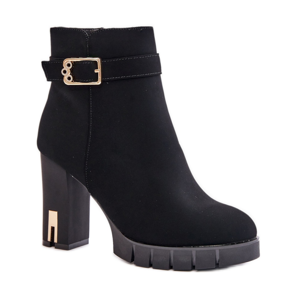 Stövlarna har isolerats med en skorfilt, vilket gör dem till ett utmärkt val under svalare dagar. Ytterligare komfort tillhandahålls av insatsen av tyg, som anpassar sig till fotens form. Rundade näsor ger den övre en klassisk karaktär, och bältet med ett gyllene spänne på den övre är en fashionabla accent som lockar uppmärksamhet.