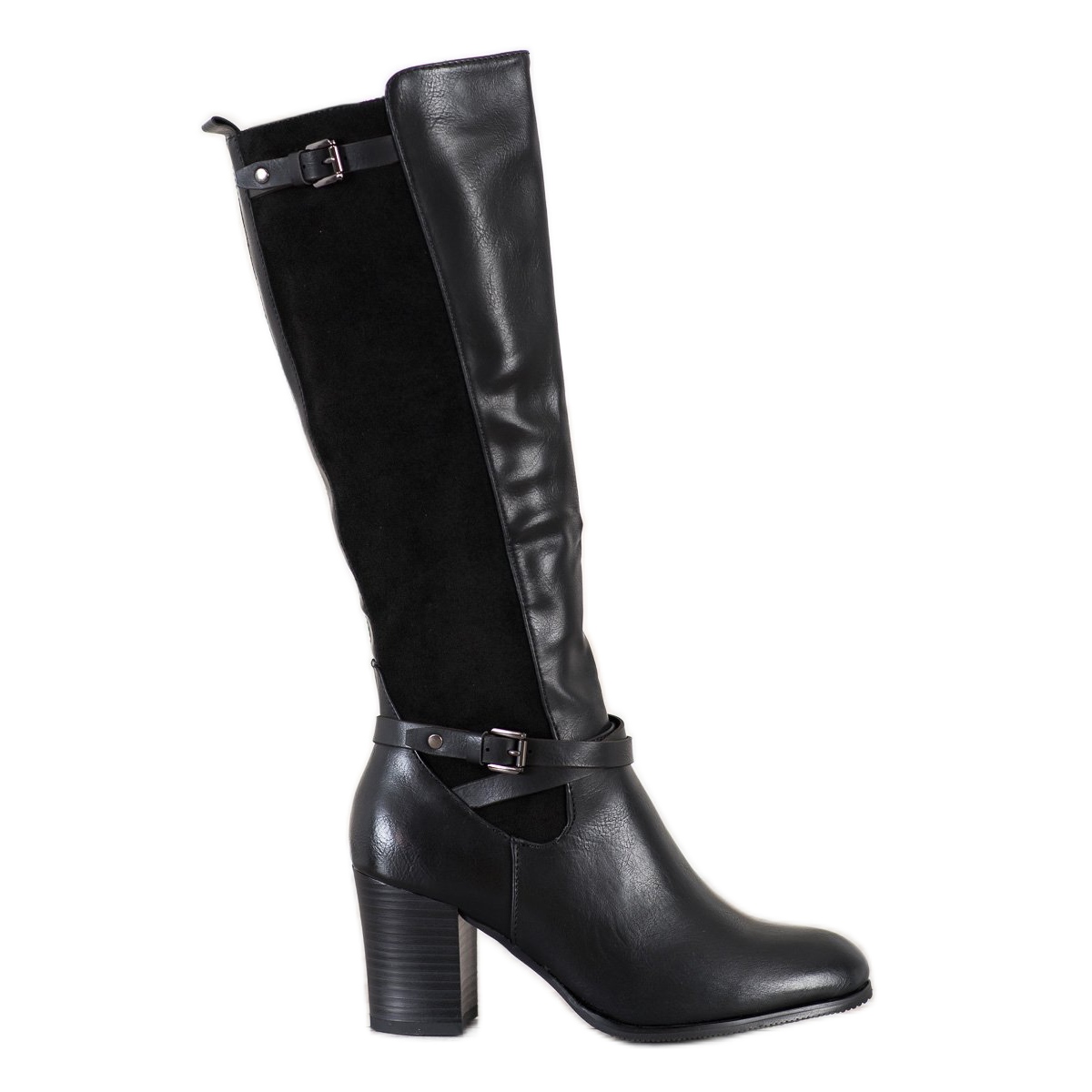 Stängda med en elegant dragkedja på sidan är dessa stövlar inte bara estetiska utan också praktiska. En unik accent är mockainlägget i kragen och ett tunt bälte med ett dekorativt spänne sammanvävt på handleden, vilket ger en stilfull karaktär. Den höga blockhälen, 7,5 cm hög, framhäver figuren perfekt, och den släta sulan av syntetiskt material säkerställer stabilitet och komfort under gång.