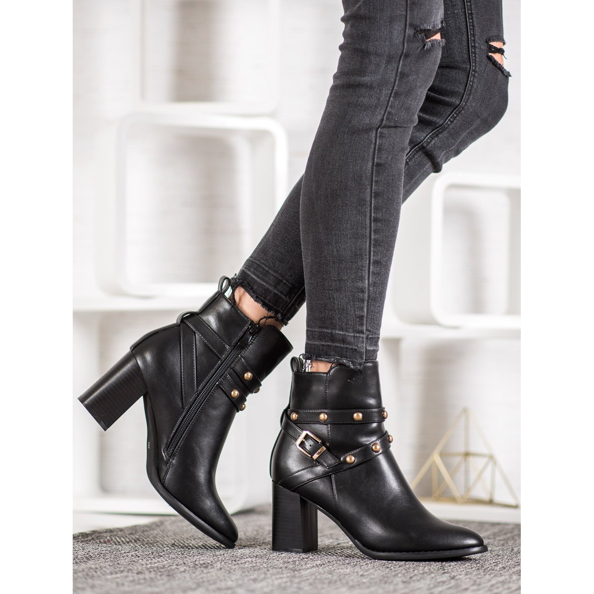 Stövlarna är gjorda av ekologiskt läder av hög kvalitet och kännetecknas av en ankellång ovandel, vilket ger klass och chic. En stabil 7,5 cm hög blockklack säkerställer komfort under användning, och den inbyggda, förstyvade hälen håller foten perfekt i rätt position. Den utvändiga dragkedjan gör det lättare att ta av och på skorna och den dekorativa remmen med spänne och snygga strassar drar till sig blickarna och ger det hela en unik karaktär.