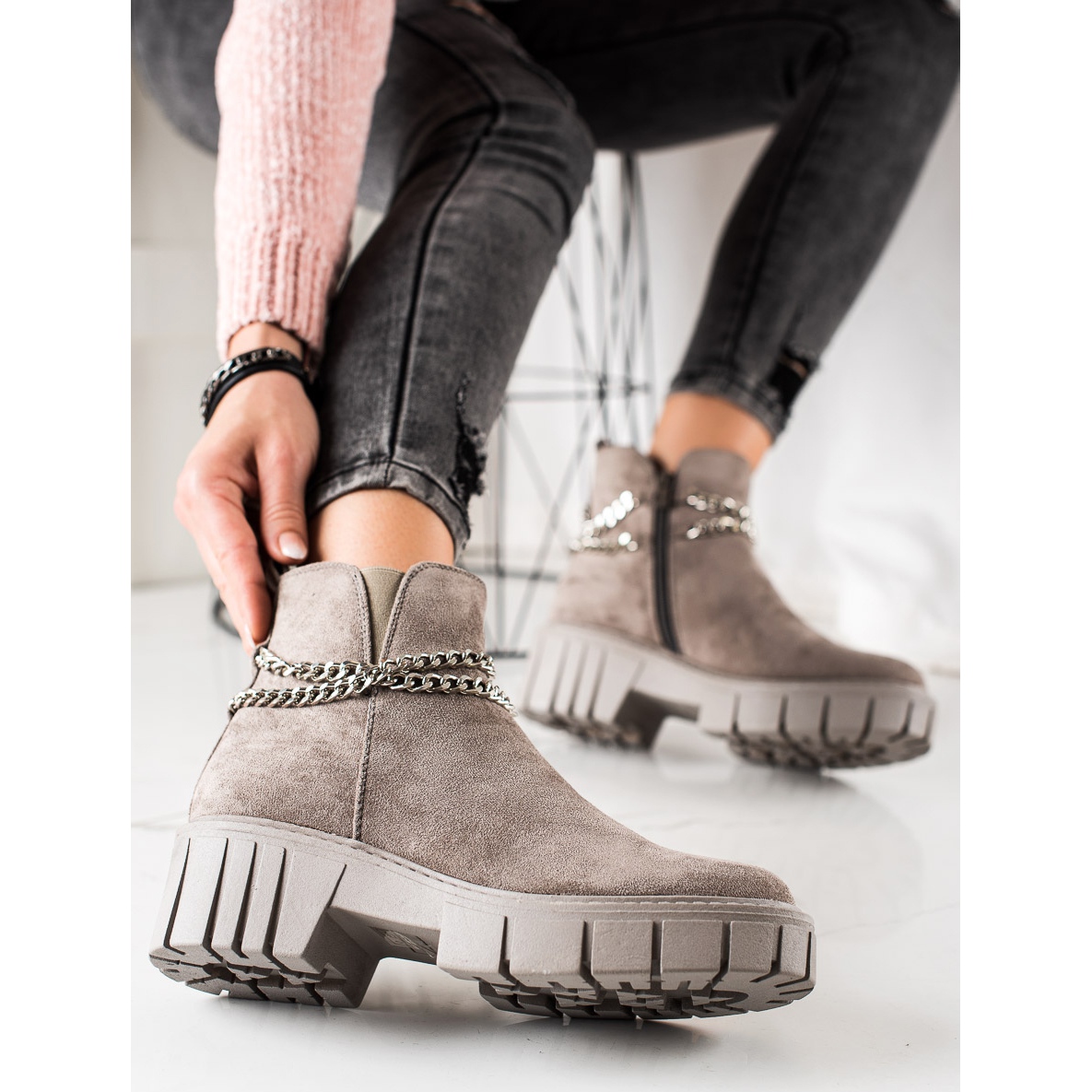 Den dekorativa kedjan ger karaktär, vilket gör stövlarna inte bara till ett praktiskt val, utan också en modeaccessoar som kommer att dra till sig uppmärksamhet. Dragkedjan gör den enkel att ta av och på och den rejäla sulan med slitbana garanterar säkerhet på olika underlag.