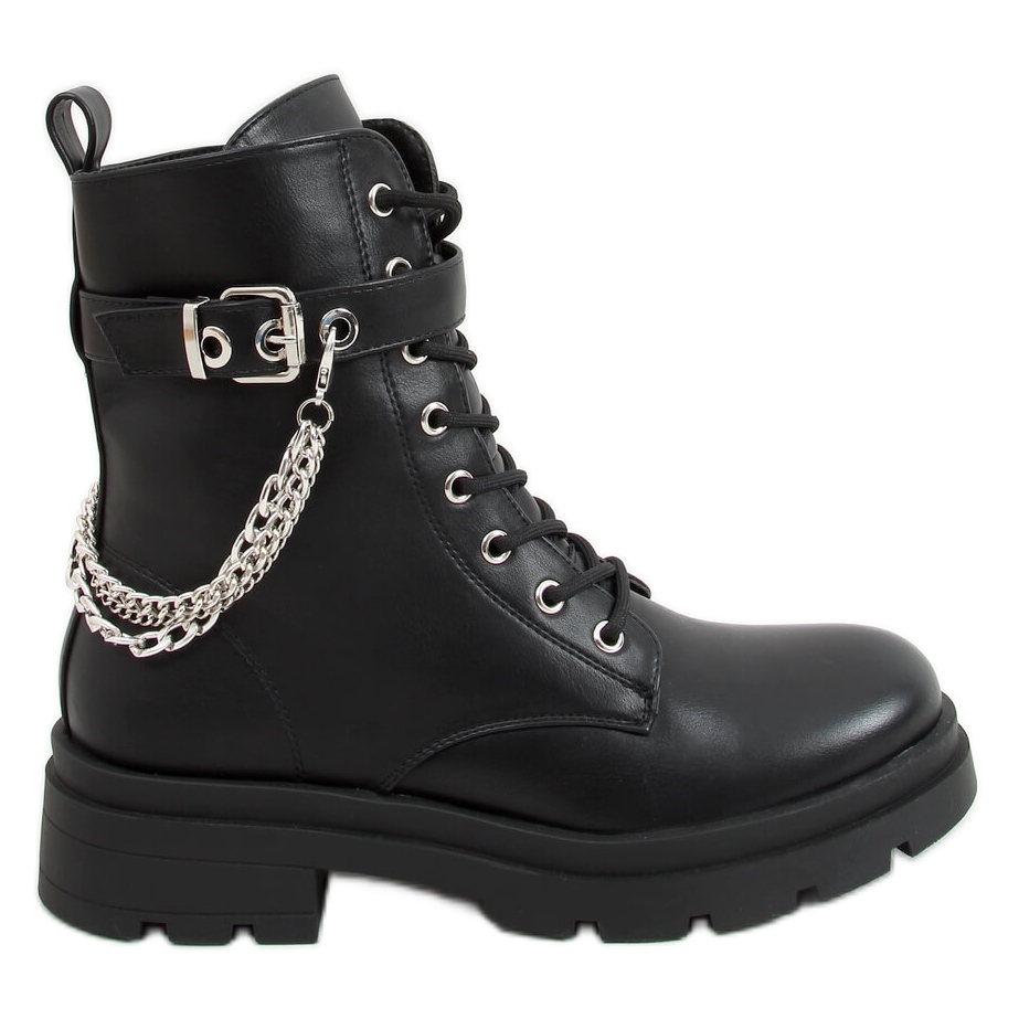 Vi presenterar Workers med kedjor i svart - modellen RQ381 Black, som säkerligen kommer att bli en oumbärlig del av din garderob! Dessa damstövlar med snörning kännetecknas av en hög sula, vilket ger karaktär och gör dem extremt snygga. Den ursprungliga designen med avtagbara kedjor är en modehit som du inte får missa!