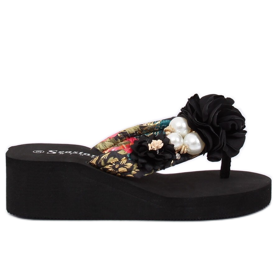 Vi presenterar svarta CK93P Svarta flip-flops med skumsula, perfekt för moderna kvinnor som värdesätter komfort och stil. Dessa charmiga flip-flops med en kilhöjd på 5 cm kombinerar elegans och funktionalitet. Tillverkade av tyg kännetecknas de av dekorativa blommor och pärlor som ger dem en unik karaktär.