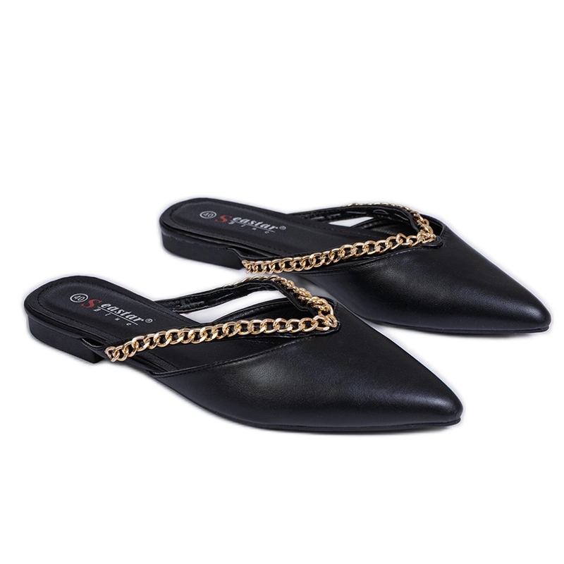 Tveka inte! Berika din skorskollektion med denna eleganta modell som kombinerar stil, komfort och funktionalitet. Svarta flip-flops dekorerade med en kedja är ett absolut måste för de kommande sommardagarna!