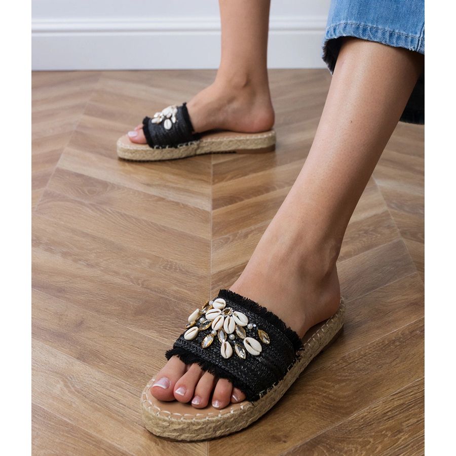 Bestäm för bekvämlighet och elegans med svarta espadrille -klaffar med skal. Denna unika modell kommer perfekt att komplettera din sommargarderob, och du kommer att känna dig modern och lätt i dem!