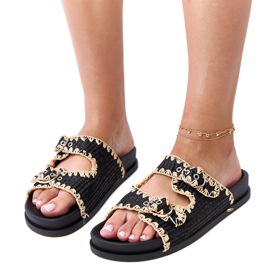 Upptäck komfort och stil på sommaren tack vare flikarna som är vävda med Sameli -spännen. Dessa eleganta svarta flip flops är ett utmärkt val för moderna kvinnor som värderar avslappnad, men samtidigt fashionabla utseende.