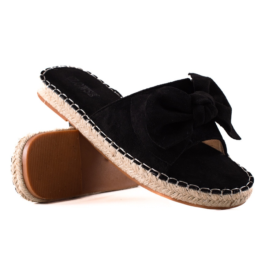 TRENDI Black Kalpes med rosett är ett perfekt komplement till sommarstyling - de kommer att se bra ut både med luftiga klänningar och vardagsjeans. Dessa rutschbanor erbjuder ett elegant utseende samtidigt som de behåller komforten, och kommer att bli en oumbärlig del av din sommargarderob.