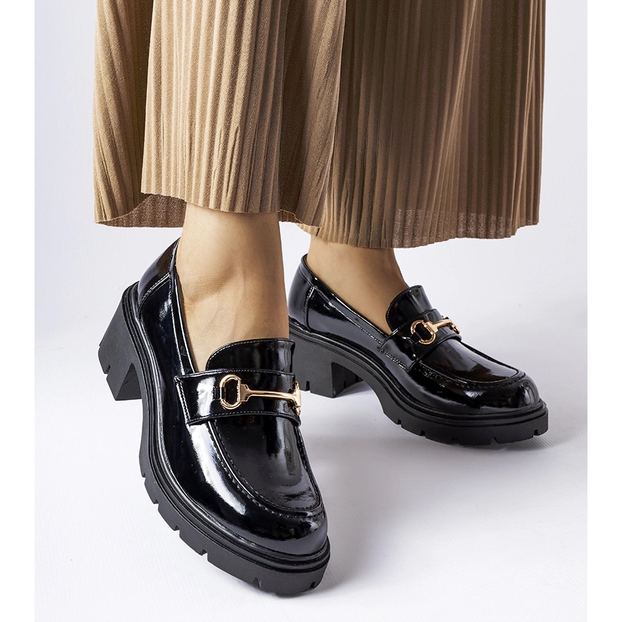 De klassiska och moderna Fabrizio Loafers är ett förslag för kvinnor som värderar elegans och komfort. Lackerad finish och en gyllene kedja på framsidan ger dem en sofistikerad karaktär, tack vare vilken du enkelt kan anpassa dem till både kontorsstyliseringar och mer avslappnade eller kvällsuppsättningar. Den låga, 6 cm hälen säkerställer stabilitet och komfort under dagen, och den glidande strukturen och den runda tån garanterar rörelsefrihet.