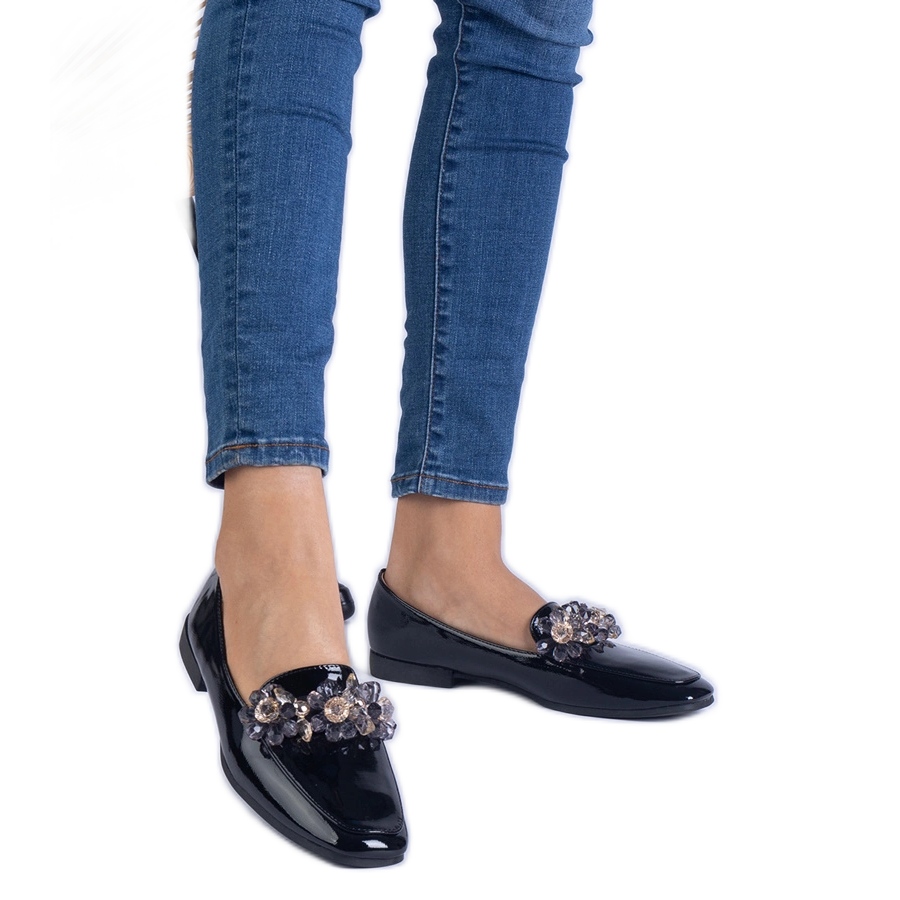 Svarta lackerade loafers med kristaller är det perfekta valet för kvinnor som vill kombinera elegans med komfort. Deras noggranna utförande från högkvalitativt lackerat organiskt läder ger dem ett unikt, effektivt utseende som passar perfekt in i aktuella modetrender. Subtila kristaller och strass tillför glans, lockar ögonen och får kvinnan som bär dem att känna sig säker i alla situationer.