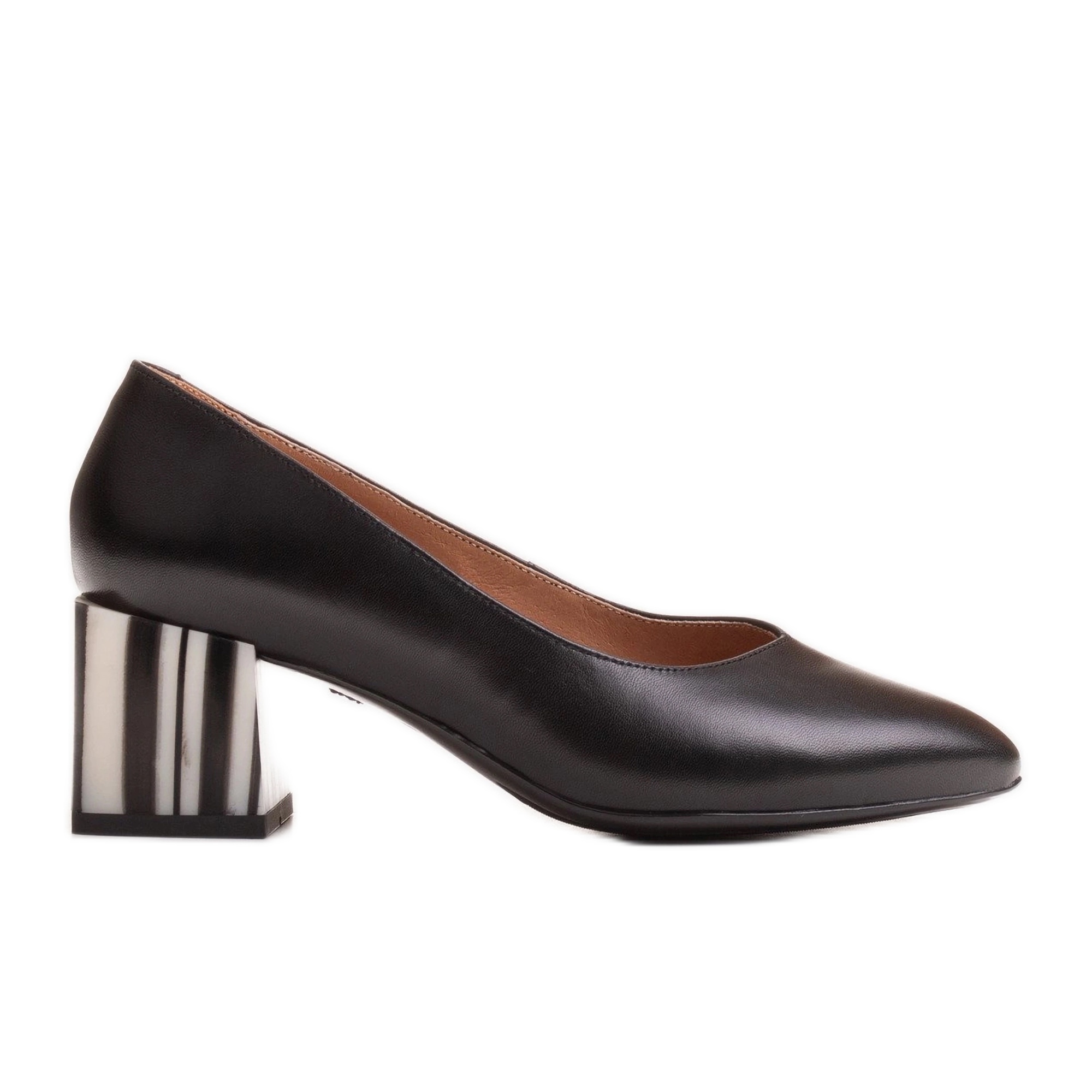 Elegant, och samtidigt med karaktär - svarta pumpar Marco -skor gjorda av naturligt spannläder är ett förslag för kvinnor som värderar klassiker med en fashionabla accent. Den karakteristiska stolpen i vita och vita ränder "Zebra" tillför styling friskhet och lätthet, och mandelstånen förlänger optiskt silhuetten på foten.