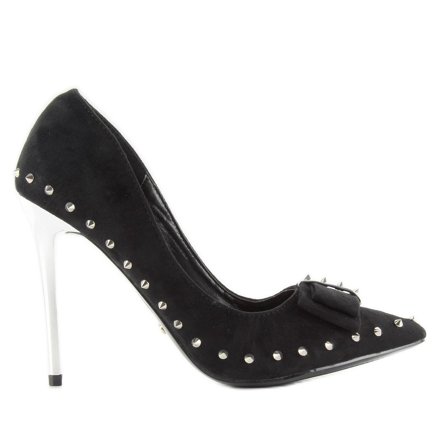 Höga klackar med dubbar och rosett i svart, modell nf-05p Black, är extremt eleganta skor som njuter av sin design och komfort. Tillverkade av ekologisk mocka av hög kvalitet, dessa pumps med en smal 11 cm hög klack är det perfekta valet för speciella tillfällen och vardagsstyling.