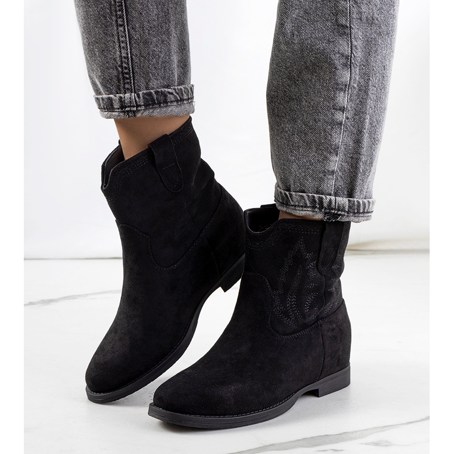 Svarta Wolfpine ankelstövlar med en inomhuskil är det perfekta valet för kvinnor som värdesätter snygga och bekväma skor. Inspirerade av cowboystil kombinerar dessa stövlar elegans och praktiska egenskaper. De är gjorda av eko-mocka och kännetecknas av sömmar på utsidan av ovandelen, vilket ger dem en unik karaktär.